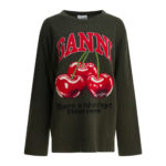 Ce pull Ganni pour femme se distingue par son design graphique et son allure contemporaine. Confectionné dans un mélange de laine et de fibres recyclées, il offre une texture compacte et confortable idéale pour la mi-saison. Son imprimé cerise accompagné du logo Ganni intégré au tricot apporte une signature visuelle forte et ludique. Doté d’un col rond, de manches longues et de finitions côtelées, ce modèle adopte une coupe oversize qui renforce son style moderne et décontracté.