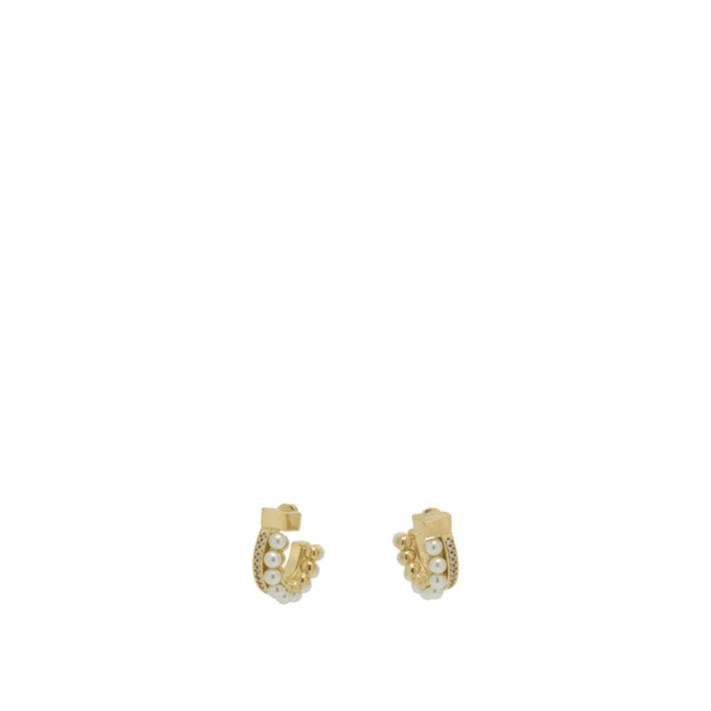 Ces boucles d’oreilles Ferragamo Gancini pour femme reflètent l’élégance iconique de la maison italienne. Réalisées en laiton poli, elles présentent une structure rigide et compacte inspirée de la célèbre silhouette Gancini, symbole emblématique de Ferragamo. Les perles appliquées apportent une touche sophistiquée et féminine, tandis que la surface lisse et brillante souligne la qualité des finitions. Le système de fermeture à tige permet une fixation directe et confortable au lobe.