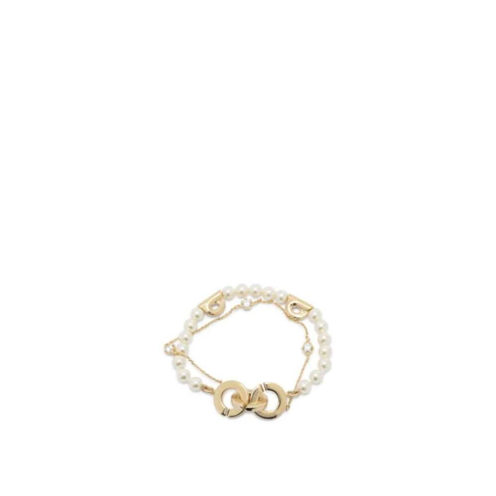 Ce bracelet Ferragamo pour femme séduit par une élégance sophistiquée et un design structuré. Conçu avec une double rangée associant chaîne en métal et perles synthétiques, il se distingue par l’alternance des silhouettes iconiques Gancini et des éléments perlés. Des inserts en cristal viennent apporter une touche lumineuse et raffinée à l’ensemble. Son fermoir en C assure une fixation sécurisée tout en soulignant la ligne rigide et contemporaine du bijou, idéal pour la saison printemps-été.