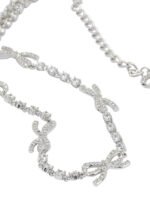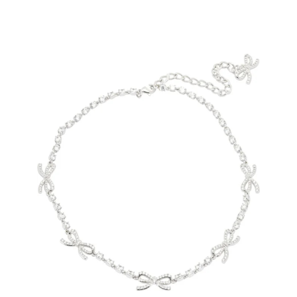 Ce collier Self-Portrait pour femme séduit par un design structuré et lumineux, mêlant élégance contemporaine et détails sophistiqués. Confectionné en laiton plaqué argent, il présente une structure rigide ornée de motifs en forme de nœuds, soulignés par des cristaux appliqués de manière symétrique. La fermeture à boucle située à l’arrière permet un ajustement précis de la longueur. Le contraste entre la surface lisse du métal et l’éclat des cristaux confère à ce bijou une allure raffinée et moderne, idéale pour la saison printemps-été.