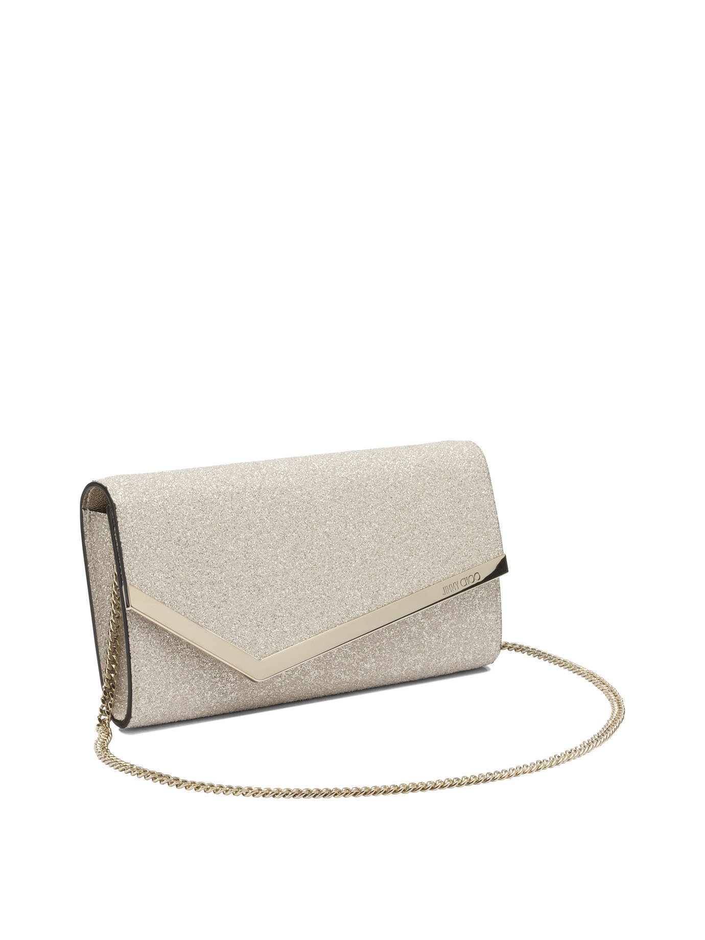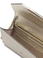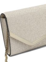 La pochette Emmie de Jimmy Choo pour femme incarne une élégance glamour et raffinée. Confectionnée en cuir verni associé à un tissu pailleté, elle présente une structure géométrique compacte au profil arrondi. Sa fermeture à bouton magnétique ornée de la gravure Jimmy Choo apporte une finition sophistiquée. Dotée d’une fine chaîne amovible, elle peut être portée à la main ou à l’épaule selon l’occasion. Son intérieur organisé avec emplacements pour cartes et poche zippée en fait un accessoire à la fois chic et pratique pour les soirées.