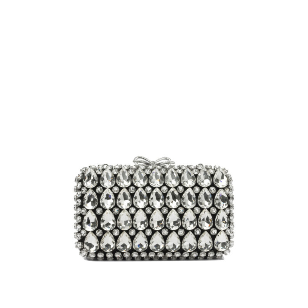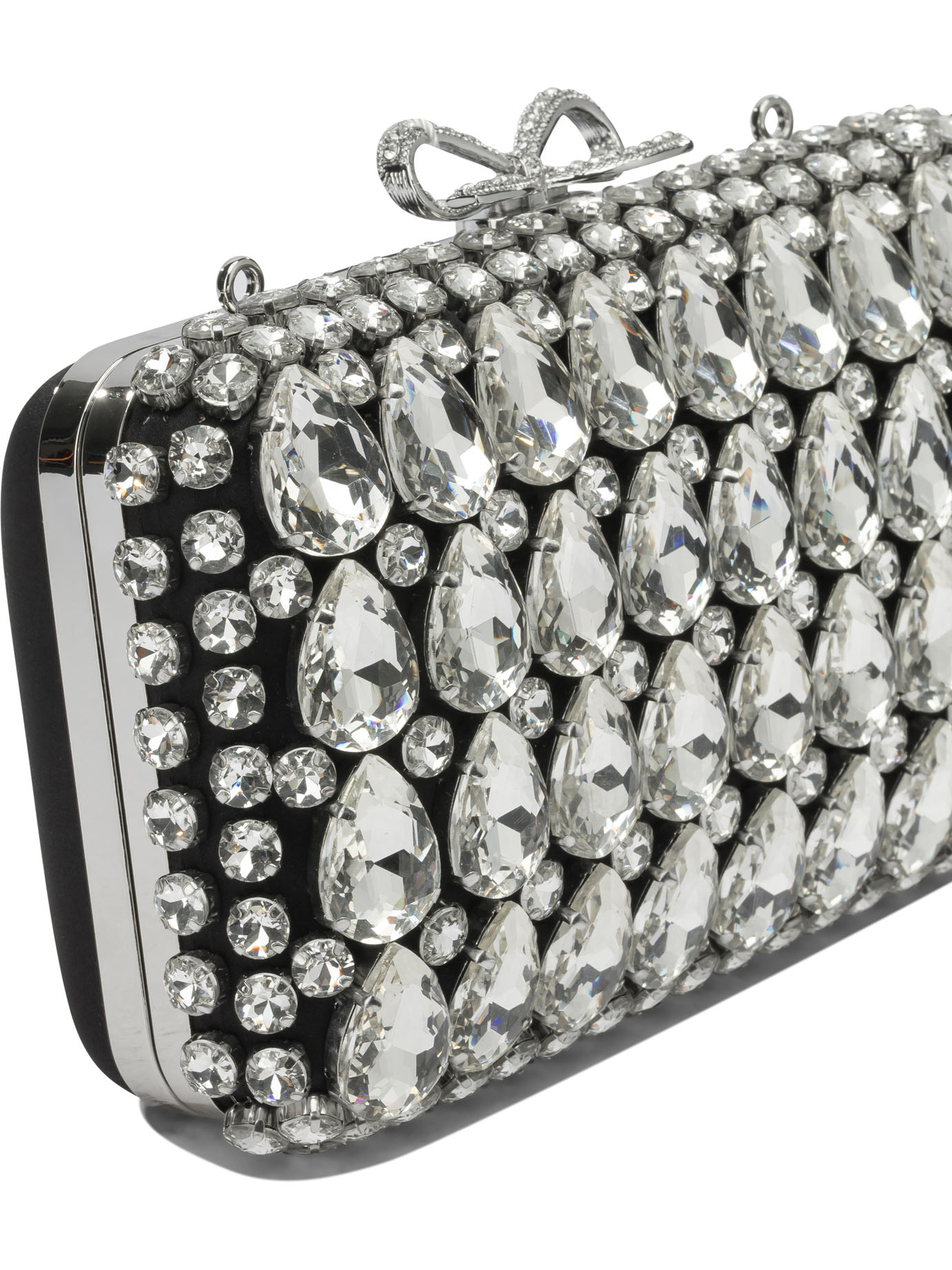 cette pochette de la maison self-portrait pour femme est une pièce de maroquinerie de soirée au design spectaculaire conçue pour la saison printemps-été 2026. fabriquée en chine, elle est confectionnée dans un satin de polyester de haute qualité (100 %) intégralement orné d’applications de strass et de cristaux en verre (100 %), offrant un éclat intense et une texture luxueuse. sa silhouette se distingue par une structure géométrique rigide qui préserve parfaitement sa forme, créant un volume sculptural et sophistiqué. le design au coloris noir profond (bblack) présente une construction soignée avec un motif de nœud surdimensionné recouvert de cristaux sur le devant, signature emblématique et audacieuse de la griffe. la structure inclut une fermeture supérieure par boucle métallique intégrée et une bandoulière en chaîne amovible, permettant une polyvalence de porté, à la main ou à l’épaule, selon vos besoins. ce modèle allie parfaitement le raffinement du satin à l’opulence des cristaux, constituant l’accessoire de gala idéal pour sublimer votre vestiaire de saison.