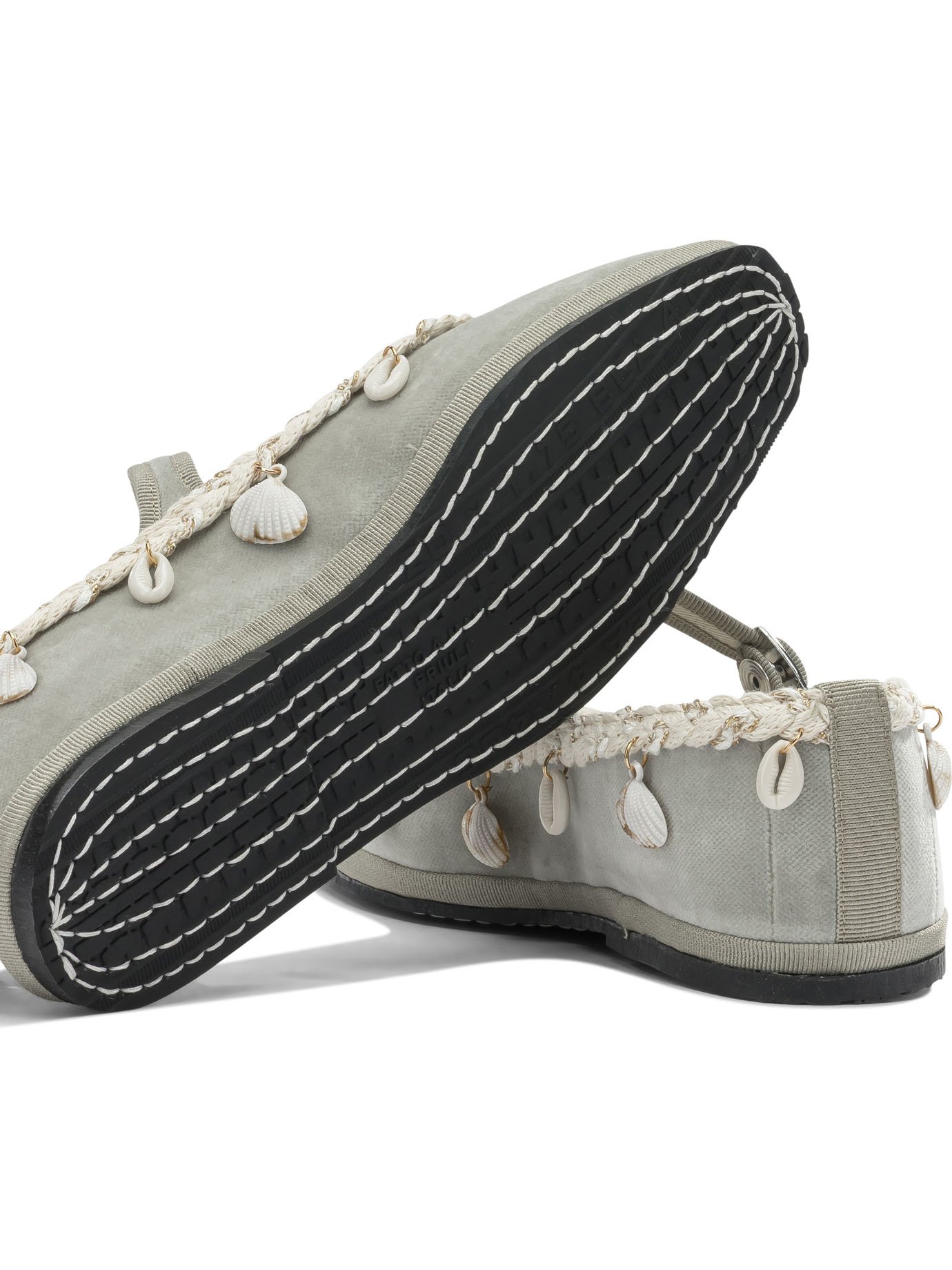 Ces ballerines Toujours « Lou Lou » pour femme s’inspirent des lignes traditionnelles des chaussures frioulanes, revisitées avec une touche artisanale et élégante. Confectionnées avec une tige en velours de coton, elles se distinguent par leur silhouette effilée et leurs finitions décoratives en passementerie. Des coquillages naturels appliqués sur la tige apportent une note originale et estivale. La semelle reprend la structure typique des modèles frioulans, tandis que la semelle intérieure légèrement rembourrée assure un confort agréable au quotidien.