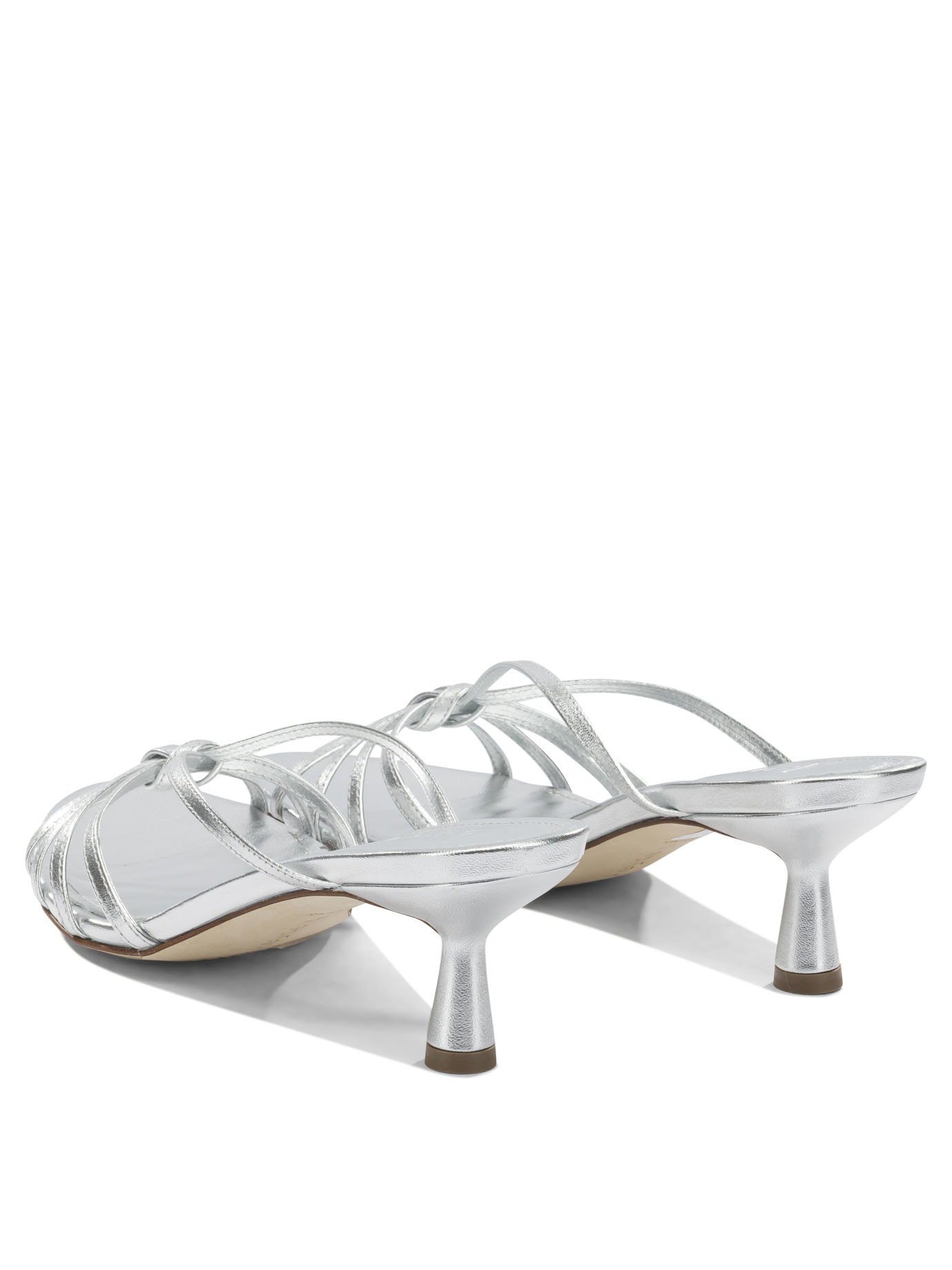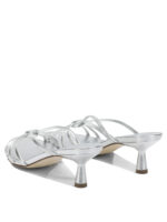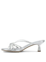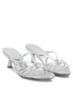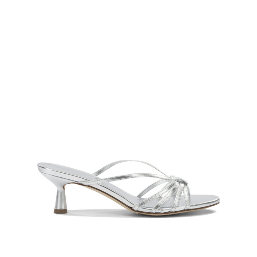 cette sandale de la maison aeyde pour femme est une pièce de chaussure au design linéaire et architectural conçue pour la saison printemps-été 2026. fabriquée en italie, elle est confectionnée dans un cuir nappa laminé de haute qualité (100 %), offrant une souplesse exceptionnelle et un éclat métallique moderne. sa silhouette se distingue par un bout rond et un talon en forme de sablier (hourglass heel) de hauteur intermédiaire (mid), signature distinctive de la marque qui allie stabilité et élégance sculpturale. le design au coloris argenté (silver) présente une construction soignée avec de fines brides qui épousent délicatement la conformation du pied pour un maintien aérien. la structure inclut une doublure interne en cuir d’agneau et une semelle extérieure robuste en cuir de vachette (100 %), garantissant une durabilité et un confort de marche optimal. ce modèle allie parfaitement le minimalisme contemporain au savoir-faire artisanal italien, constituant un accessoire sophistiqué et polyvalent pour votre vestiaire de saison.