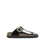 cette sandale de la maison birkenstock pour femme est une pièce de chaussure au design ergonomique et épuré conçue pour la saison printemps-été 2026. fabriquée en allemagne, elle est confectionnée dans un cuir naturel de première qualité avec une finition vernie (2,8-3,2 mm d’épaisseur) et une semelle en eva (100 %), offrant une structure stable, une main lisse et une excellente flexibilité propre aux standards de la haute manufacture de confort. sa silhouette « gizeh » se distingue par son architecture entre-doigt et son profil profilé, alliant l’esthétique fonctionnelle de la griffe à une sophistication urbaine idéale pour vos tenues de prestige estivales. le design au coloris noir brillant présente une construction soignée avec une boucle convexe en zamak brillant, signature du prestige et de l’identité visuelle de birkenstock. la structure inclut un lit de pied anatomique en liège et latex, garantissant une silhouette équilibrée, une grande liberté de mouvement et un confort de porter exemplaire. ce modèle allie parfaitement la noblesse de matériaux naturels sélectionnés à une ingénierie orthopédique moderne, constituant une pièce de collection indispensable pour votre vestiaire.