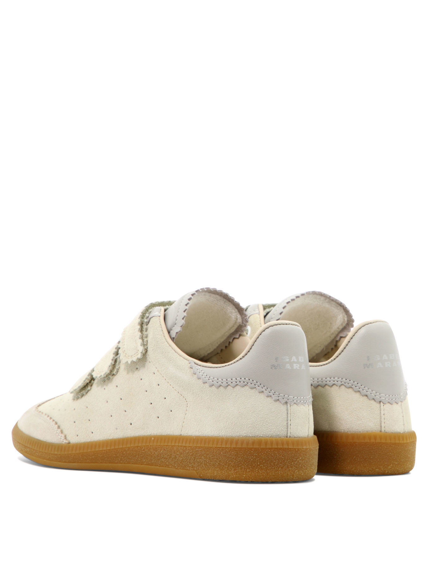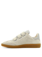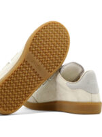 cette basket basse de la maison isabel marant pour femme est une pièce de maroquinerie au design rétro-chic et minimaliste conçue pour la saison printemps-été 2026. fabriquée au portugal, elle est intégralement confectionnée dans un cuir de veau velours (suede) de première qualité, offrant une structure souple, une main soyeuse et une excellente respirabilité propre aux standards de la haute manufacture européenne. sa silhouette « beth » se distingue par son profil bas et sa fermeture à trois brides (triple pull tabs), alliant l’esthétique décontractée de la griffe à une sophistication urbaine idéale pour vos tenues de prestige. le design au coloris beige présente une construction soignée avec une languette rembourrée et un renfort au talon logotypé, signature du prestige et de l’identité visuelle d’isabel marant. la structure inclut une doublure intégrale en cuir et une semelle en caoutchouc à bordure crantée, garantissant une silhouette épurée, une grande liberté de mouvement et un confort de porter exemplaire. ce modèle allie parfaitement la noblesse d’une peau sélectionnée à une ingénierie de soulier de ville, constituant un essentiel de collection indispensable pour votre vestiaire.