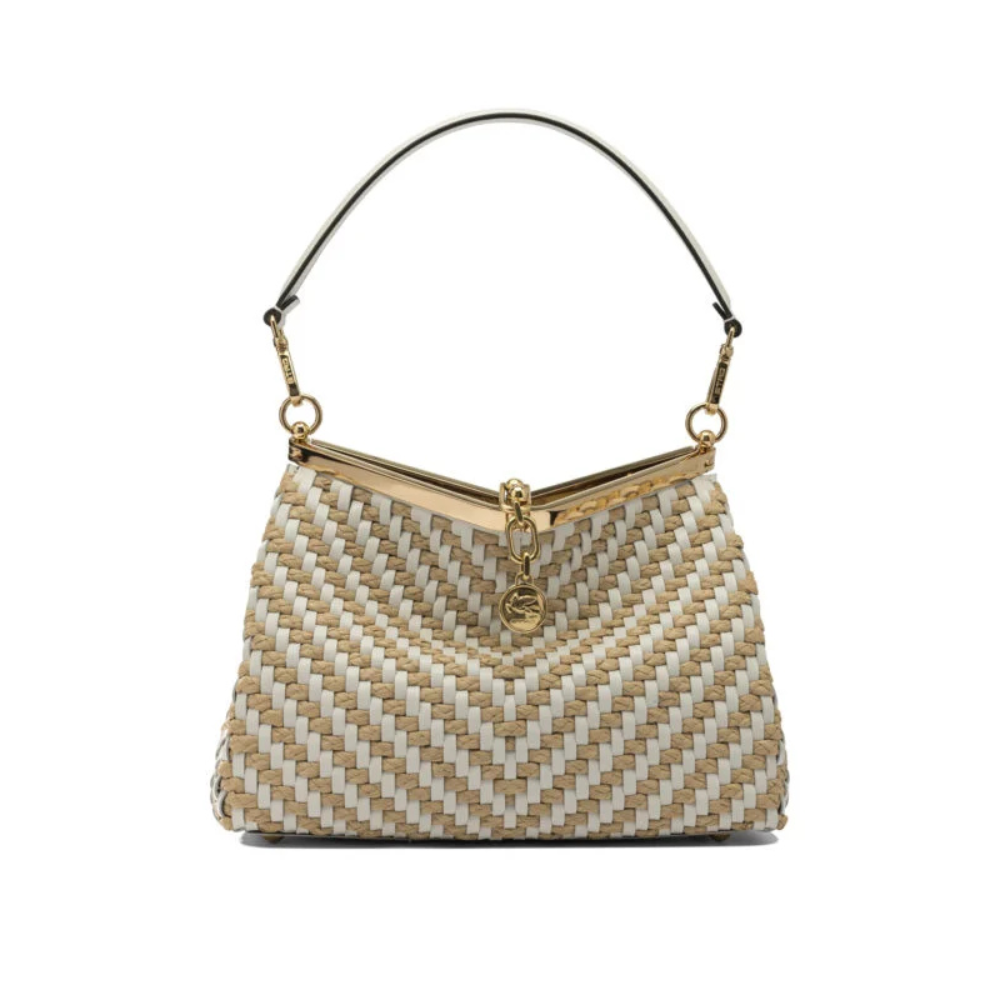 Ce sac porté épaule Etro Vela pour femme incarne l’élégance estivale et le raffinement artisanal propres à la maison italienne. Confectionné en raphia tressé et cuir, il se distingue par une structure rigide et une silhouette compacte, idéale pour un porté sophistiqué. Le fermoir métallique orné de la pièce Pegasus frappée apporte une signature iconique et précieuse, tandis que les finitions dorées soulignent le caractère luxueux du modèle. Son anse amovible permet une utilisation polyvalente, adaptée aux besoins du quotidien durant la saison printemps-été.