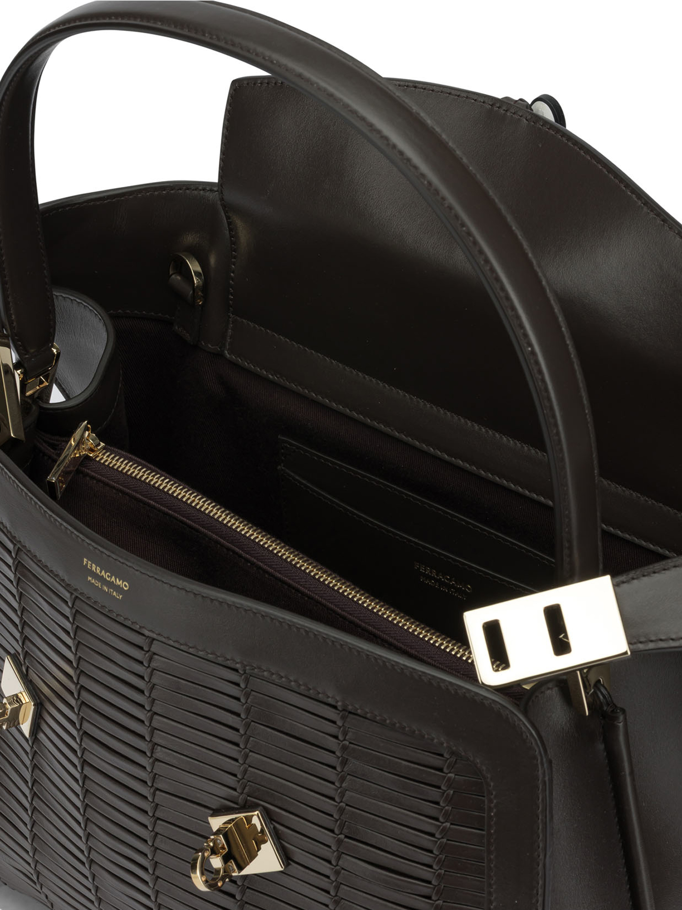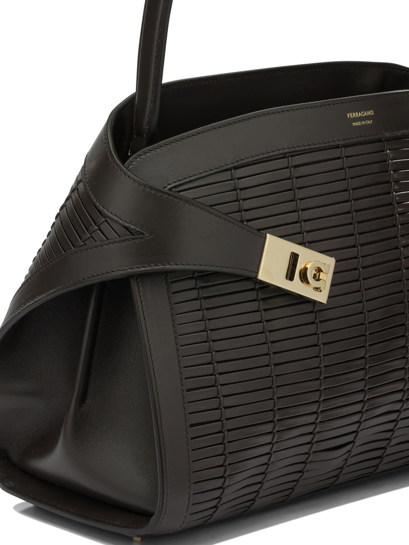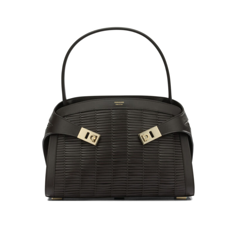 « Ferragamo » sac à main femme marron medium en cuir tressé à boucles dorées