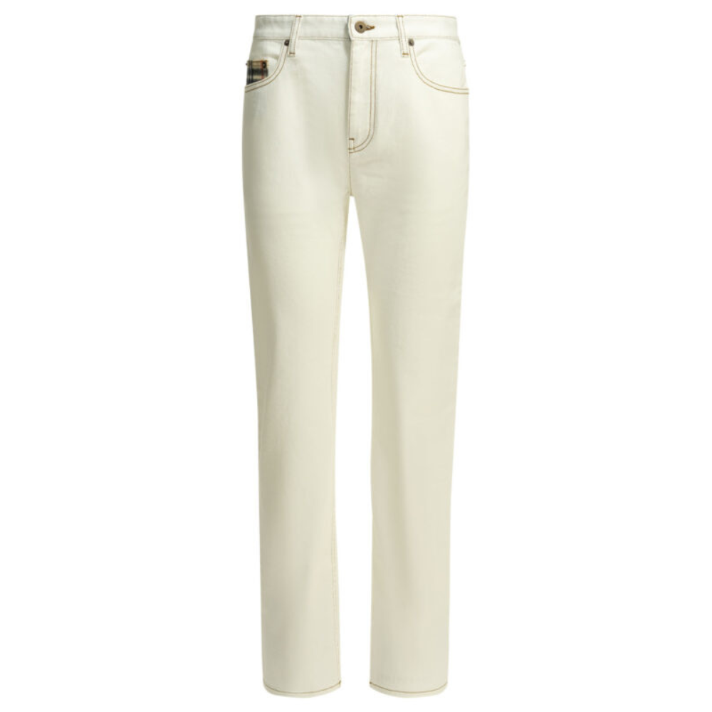 cette pièce de la maison burberry pour femme est un vêtement de prêt-à-porter au design épuré et sophistiqué conçu pour la saison printemps-été 2026. fabriquée en roumanie, elle est confectionnée dans un denim de coton de première qualité (98 %) enrichi d’une touche d’élasthanne (2 %), offrant une structure ajustée, une main compacte et une souplesse optimale propre aux standards de la haute manufacture burberry. sa silhouette « dalia check » se distingue par sa ligne droite légèrement fuselée et sa surface uniforme, alliant l’esthétique intemporelle de la griffe à une élégance contemporaine idéale pour vos tenues de prestige quotidiennes. le design au coloris blanc présente une construction soignée avec des finitions précises et une structure nette, signature du prestige et de l’identité visuelle de burberry. la structure inclut cinq poches intégrées et un patch logo à l’arrière, garantissant une silhouette équilibrée, une grande liberté de mouvement et un confort de porter exemplaire. ce modèle allie parfaitement la noblesse d’une fibre naturelle sélectionnée à une ingénierie de coupe slim haut de gamme, constituant une pièce de collection indispensable pour votre vestiaire.