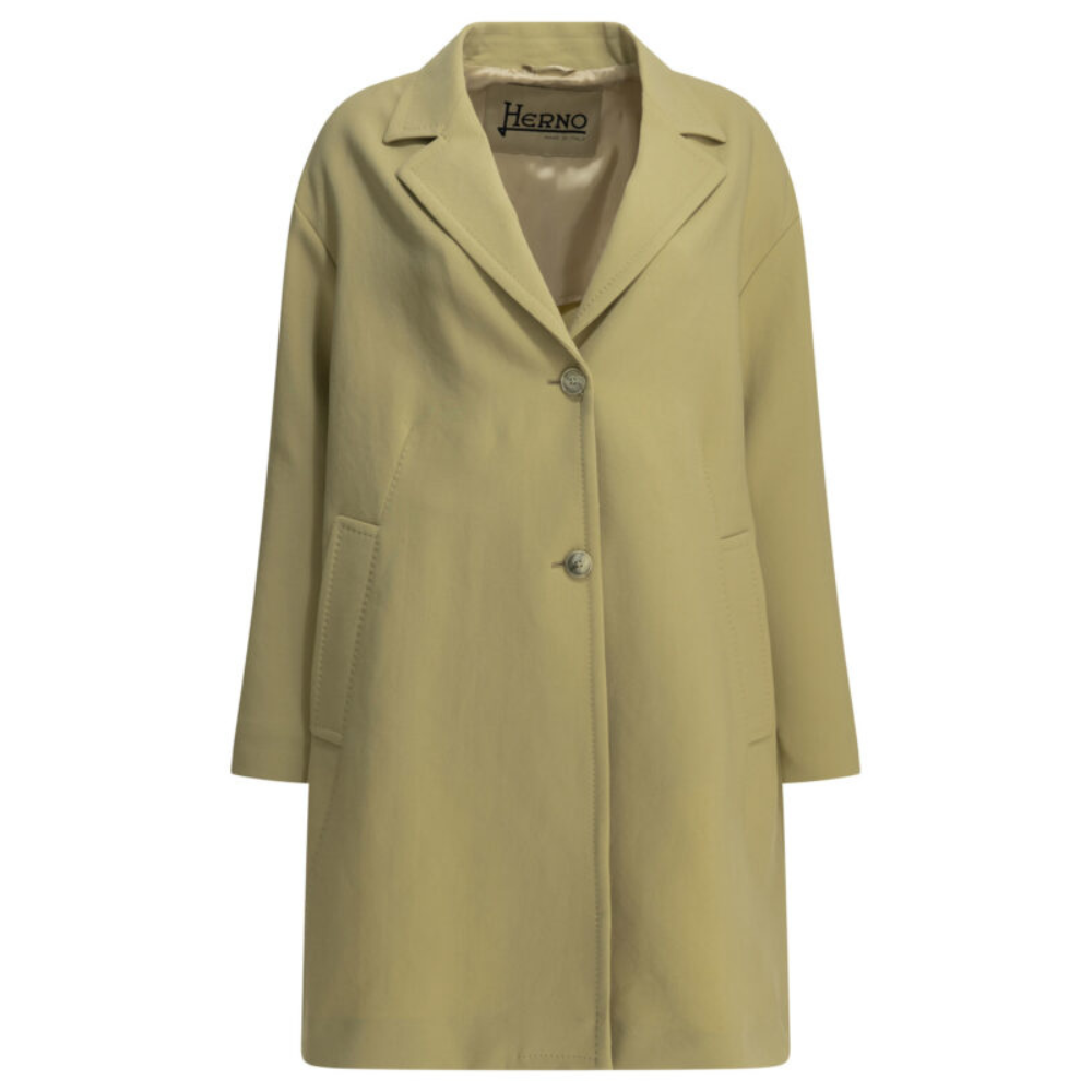ce manteau de la maison herno pour femme est une pièce de prêt-à-porter au design fluide et minimaliste conçue pour la saison printemps-été 2026. fabriqué en italie, il est intégralement confectionné dans un polyester de première qualité (100 %) à la texture lisse et compacte, offrant une structure légère, une excellente tenue de forme et une résistance accrue aux froissements. sa silhouette se distingue par une coupe légèrement évasée et une longueur au-dessus du genou, alliant l’élégance du vestiaire classique à une aisance décontractée (relaxed fit) idéale pour la mi-saison. le design au coloris beige sable présente une construction soignée avec des revers classiques et une fermeture frontale à boutons qui souligne la précision de la coupe. la structure inclut des manches longues à la ligne linéaire, des poches latérales passepoilées discrètement intégrées ainsi qu’une doublure intégrale en viscose (100 %) garantissant un glissé parfait sur vos vêtements. ce modèle allie parfaitement la noblesse des finitions de luxe à une silhouette polyvalente et équilibrée, constituant une pièce de prestige pour votre vestiaire de saison.