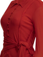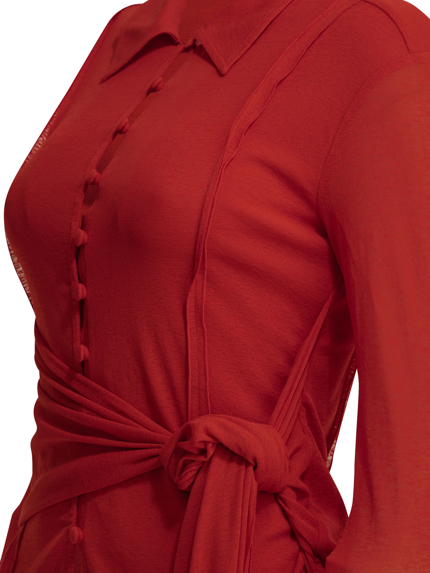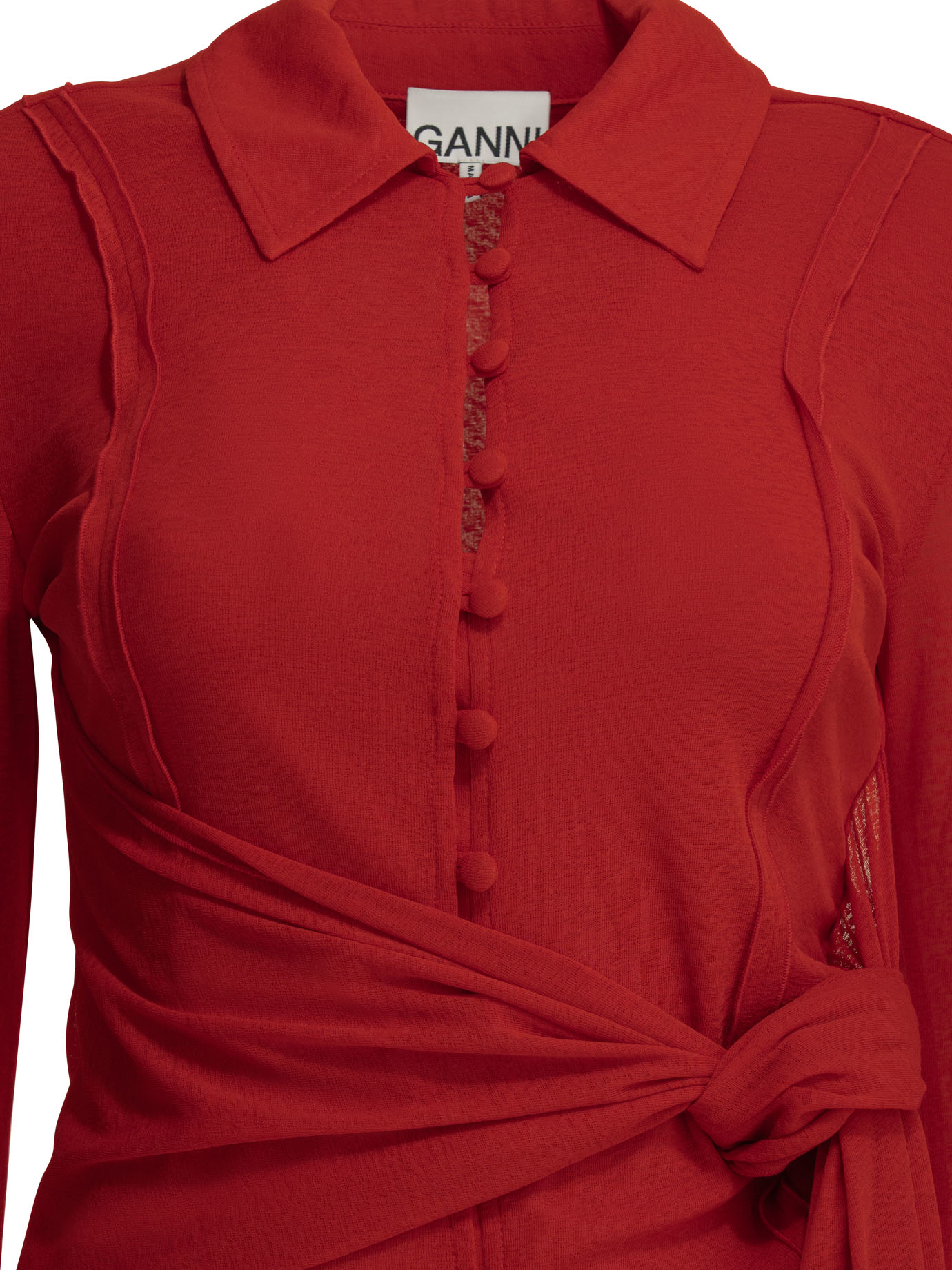 ce polo de la maison ganni pour femme est une pièce de prêt-à-porter au design audacieux et éco-responsable conçue pour la saison printemps-été 2026. fabriqué en turquie, il est intégralement confectionné dans une maille de polyester recyclé (100 %), offrant une texture légère et une empreinte environnementale réduite. sa silhouette se distingue par une coupe ajustée (regular fit) et des manches longues au fini légèrement translucide, apportant une dimension aérienne et sophistiquée à la pièce. le design au coloris rouge vibrant (606p) présente une construction soignée avec un col polo classique et une ouverture frontale partielle fermée par de petits boutons ton sur ton. la structure est magnifiée par un drapé frontal et une bande latérale nouée à la hanche, se prolongeant par un long ruban décoratif qui souligne délicatement la silhouette. ce modèle allie parfaitement l’esthétique scandinave contemporaine à une fonctionnalité durable, constituant un haut de caractère pour votre vestiaire de saison.