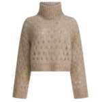 Le pull col roulé Dazzling Net de Brunello Cucinelli pour femme reflète l’élégance artisanale et le raffinement de la maison italienne. Confectionné en fil de mohair et de laine légère, il se distingue par sa maille ajourée à la texture vaporeuse, subtilement ornée de petites paillettes qui illuminent l’ensemble. Sa coupe décontractée avec épaules tombantes et manches larges offre une silhouette douce et aérienne, tandis que les finitions côtelées apportent une structure délicate. Une pièce sophistiquée et lumineuse, idéale pour la saison froide.