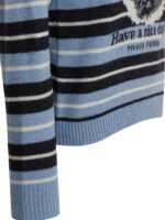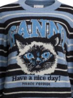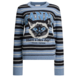 Le pull femme Ganni en bleu clair est confectionné dans un fil mélangé associant laine vierge, laine recyclée et polyamide recyclé, soulignant l’engagement responsable de la marque. Sa silhouette regular à col rond et manches longues offre un porté confortable et structuré pour la saison printemps été 2026. Les finitions côtelées au col, aux poignets et à l’ourlet assurent maintien et tenue. Son imprimé graphique à rayures intègre le logo Ganni et le message « Have a great day! Please recycle. », apportant une touche expressive et contemporaine.