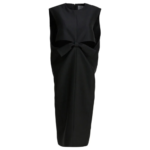 Cette robe midi Balenciaga pour femme illustre l’approche sculpturale et contemporaine de la maison. Confectionnée dans un mélange raffiné de laine et de soie, elle présente une texture douce avec un léger éclat. Sa construction arrondie façon cocon crée un volume structuré et un élégant effet drapé. Le col rond épuré et l’ouverture sous la poitrine ornée d’un nœud apportent une touche féminine subtile, tandis que la fermeture zippée invisible au dos et la fente arrière assurent confort et liberté de mouvement.