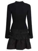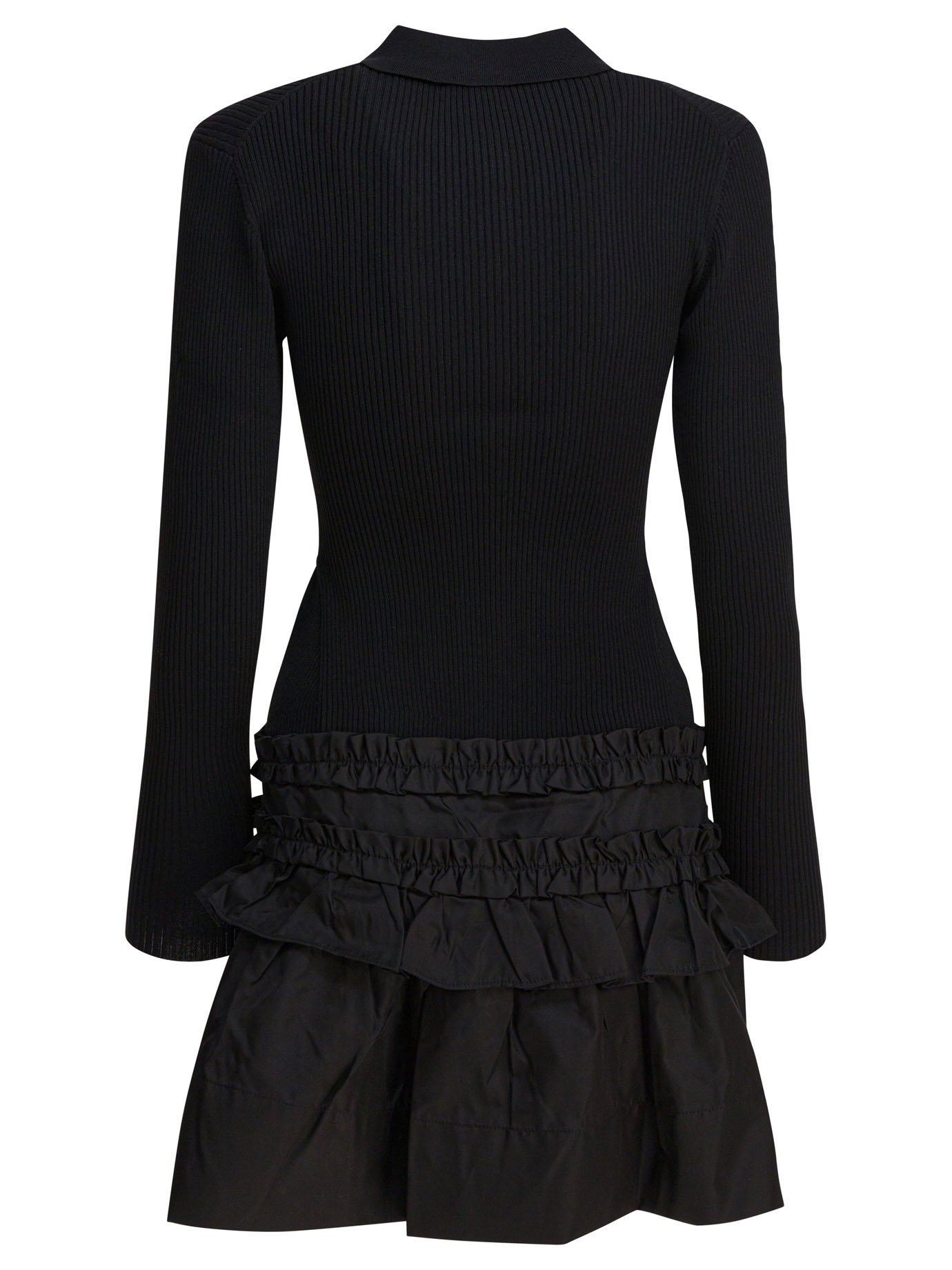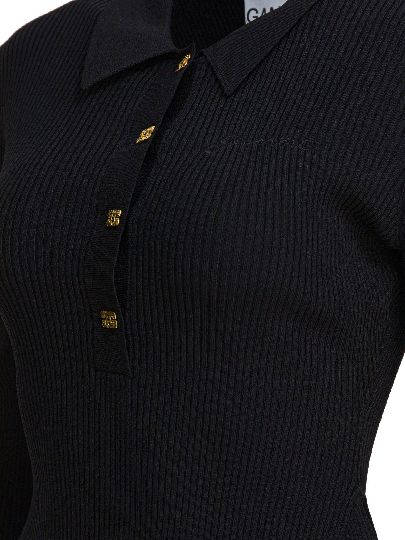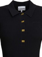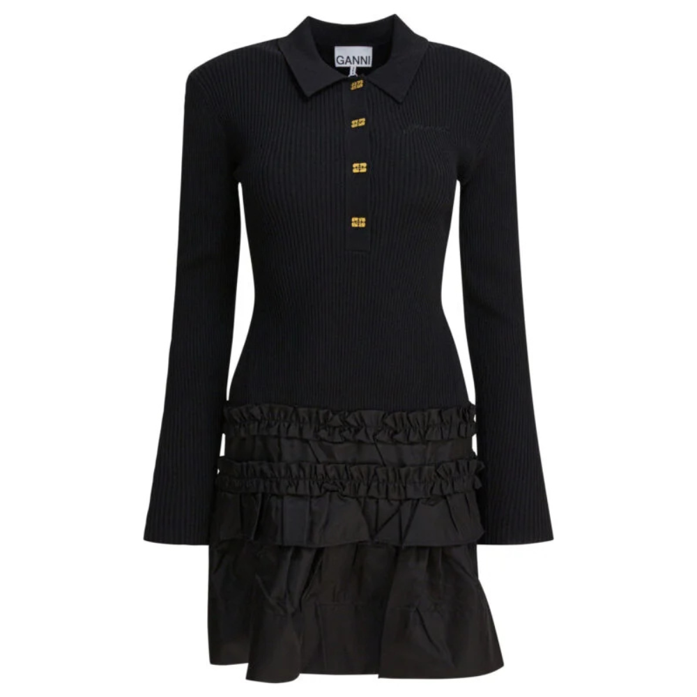 Cette robe évasée Ganni pour femme associe féminité contemporaine et engagement responsable. Confectionnée en maille compacte à base de viscose et de nylon recyclé, elle offre une tenue structurée et un confort optimal. La silhouette est dynamisée par une jupe à volants qui apporte du mouvement, tandis que le buste et les manches côtelés soulignent la ligne. Le col classique et la patte de boutonnage frontale avec boutons logotypés viennent parfaire ce modèle élégant, idéal pour la saison automne-hiver.
