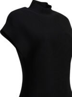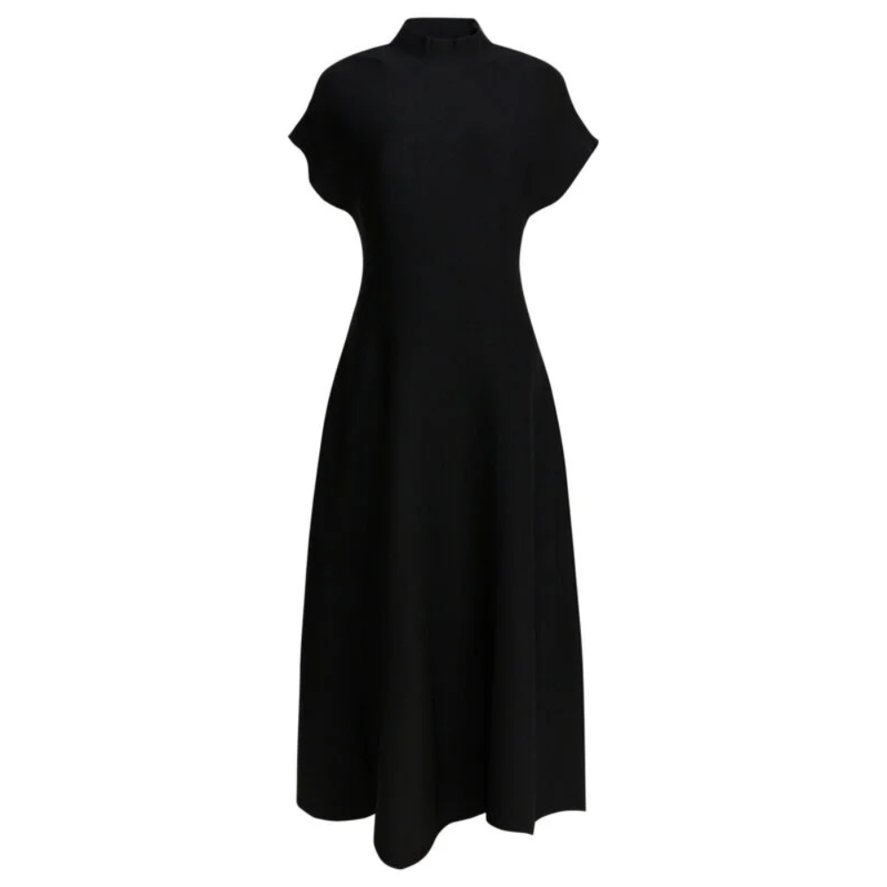 Cette robe midi Khaite pour femme séduit par sa silhouette élégante et sa construction structurée en maille Milano. Confectionnée en viscose, elle présente une texture compacte et légèrement brillante qui souligne son allure raffinée. Son col montant et sa ligne fluide qui s’ouvre progressivement à partir de la taille créent une silhouette féminine et sophistiquée. Les manches courtes drapées encadrent délicatement les épaules, tandis que la fermeture zippée discrète sur le côté du col apporte une finition fonctionnelle et moderne.