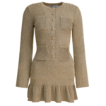 Cette robe courte Self-Portrait se distingue par son allure sophistiquée et son éclat raffiné. Confectionnée en maille extensible avec fibres de lurex, elle offre une texture lumineuse et une élasticité qui épouse la silhouette tout en garantissant confort et souplesse. Sa coupe ajustée met en valeur les formes, renforcée par des épaules marquées et une fermeture fonctionnelle à boutons sur le devant. Avec ses manches longues et sa finition brillante, cette robe dorée est idéale pour les soirées et occasions spéciales de la saison automne-hiver.