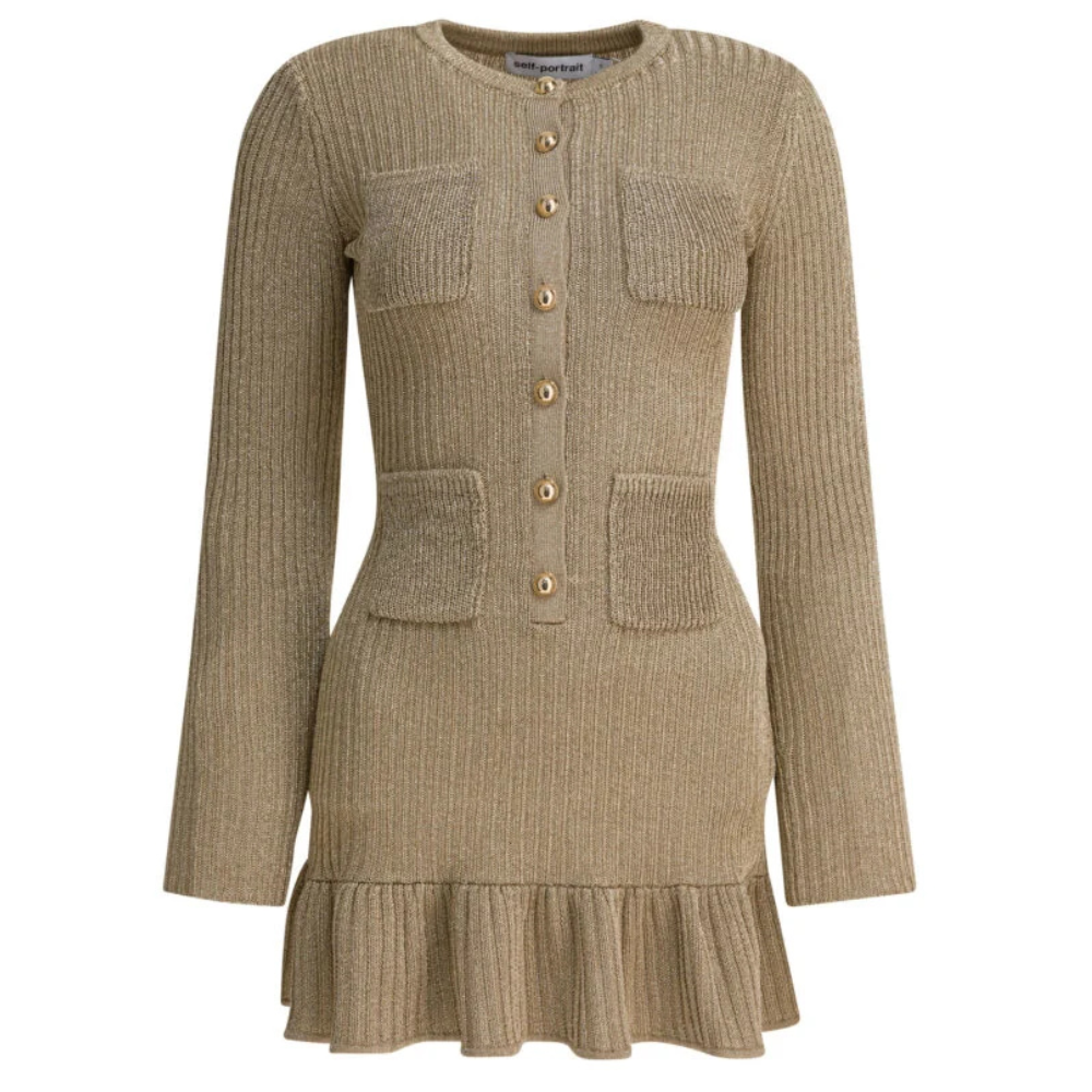 « Self-Portrait » robe courte femme dorée maille lurex coupe slim manches longues