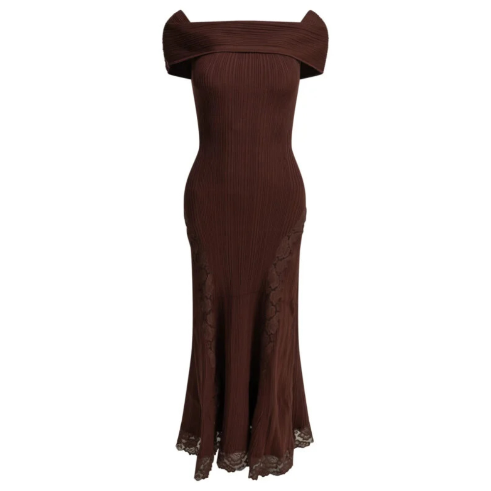 La robe midi Self-Portrait pour femme séduit par sa silhouette féminine et sa construction sophistiquée en maille stretch. Ajustée au niveau du buste et des hanches, elle s’évase délicatement vers le bas pour créer une allure élégante et fluide. Son encolure bandeau sans bretelles met en valeur les épaules, tandis que les inserts en dentelle contrastante apportent des jeux de transparence subtils. Confectionnée dans un mélange de viscose, polyester, polyamide et élasthanne, elle offre confort, maintien et liberté de mouvement.