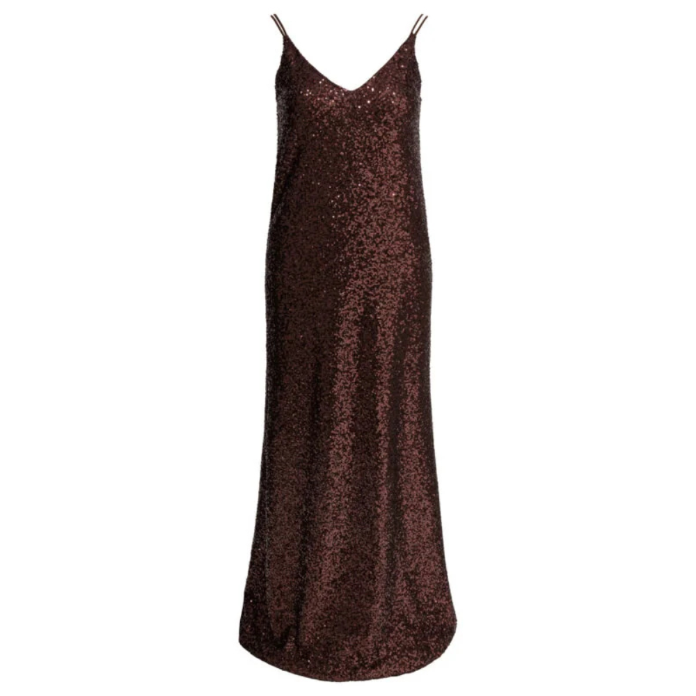 Cette robe longue Semper pour femme séduit par son allure lumineuse et sa silhouette fluide. Entièrement recouverte de sequins appliqués sur une base légère, elle capte la lumière avec élégance pour la saison printemps-été 2026. Son encolure en V à l’avant est sublimée par de fines doubles bretelles, tandis que le dos ouvert dévoile un jeu de brides croisées apportant modernité et mouvement. Sa coupe regular, légèrement évasée à l’ourlet, accompagne la démarche avec légèreté.