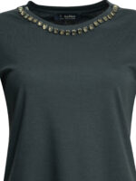 caractéristique spéciale : encolure ronde agrémentée d’une broderie de chatons bijoux sertis (jeweled bezels), apportant un éclat précieux et remplaçant l’usage d’un collier pour une allure sophistiquée sans effort