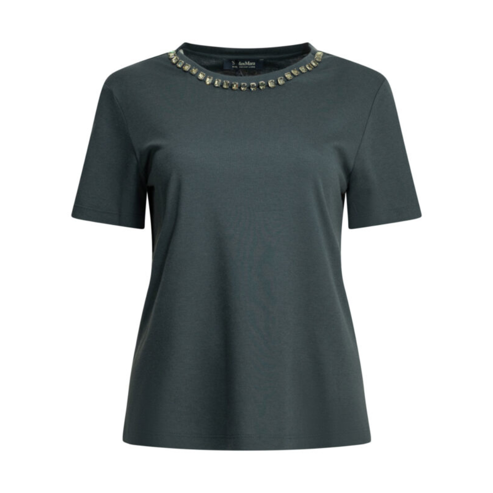cette pièce de la collection max mara s pour femme est un vêtement de prêt-à-porter au design sophistiqué et précieux conçu pour la saison printemps-été 2026. fabriquée en italie, elle est confectionnée dans un jersey de première qualité associant le coton (50 %) et le modal (50 %), offrant une structure fluide, une main soyeuse et un drapé élégant propre aux standards de la haute manufacture italienne max mara. sa silhouette se distingue par ses lignes droites et son ornementation luxueuse, alliant l’esthétique épurée de la griffe à une finition joaillière idéale pour vos tenues de prestige quotidiennes ou vos événements habillés. le design au coloris bleu présente une construction soignée avec une broderie de chatons sertis appliquée à l’encolure, signature du prestige et de l’identité visuelle de la ligne s max mara. la structure inclut des manches courtes et un ourlet droit, garantissant une silhouette équilibrée, une grande liberté de mouvement et un confort de porter exemplaire. ce modèle allie parfaitement la noblesse d’un mélange de fibres naturelles et artificielles sélectionnées à une ingénierie de design haut de gamme, constituant une pièce de collection indispensable pour votre vestiaire.
