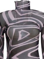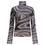 Ce t-shirt Pucci pour femme incarne l’esthétique graphique et audacieuse emblématique de la maison italienne. Confectionné en tulle stretch léger et semi-transparent, il épouse délicatement la silhouette grâce à une coupe slim près du corps. Son col montant et ses manches longues renforcent son allure sophistiquée, tandis que l’imprimé Labirinto, appliqué sur toute la surface, crée un effet visuel fort et continu sans rupture de matière. Le tissu extensible accompagne naturellement les mouvements, offrant confort et maintien. Une pièce statement, idéale pour la saison Automne Hiver, à porter seule ou en superposition pour un look contemporain et affirmé.