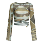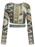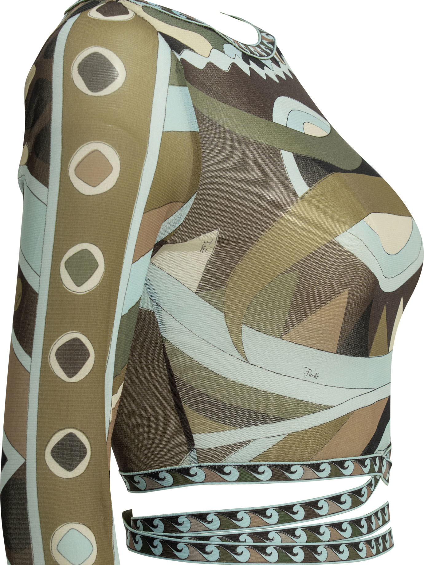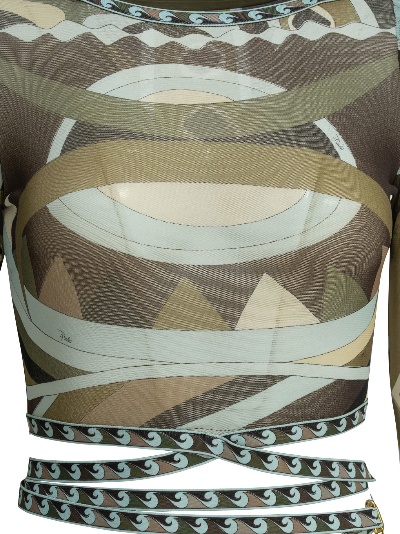 ce top ajusté de la maison pucci pour femme est une pièce de prêt-à-porter au design graphique et architectural conçue pour la saison printemps-été 2026. fabriqué en italie, il est intégralement confectionné dans un tulle de polyamide de première qualité (100 %), offrant une structure légère, une transparence délicate et une maille fine propre aux standards de la haute manufacture italienne. sa silhouette se distingue par une coupe cintrée et une ligne près du corps, alliant l’esthétique psychédélique de la griffe à une sophistication moderne idéale pour vos tenues de prestige. le design au coloris multicolore présente une construction soignée avec l’imprimé « vivara » sur l’ensemble de la pièce, signature du prestige et de l’identité visuelle de pucci qui garantit un placement de motif variable et unique pour chaque exemplaire. la structure inclut une encolure droite (straight neckline), des manches longues transparentes et une bride ajustable ornée d’une boucle logo soulignant la taille, garantissant une silhouette définie, une grande liberté de mouvement et un confort de porter exemplaire. ce modèle allie parfaitement la noblesse d’une fibre technique sélectionnée à une ingénierie de coupe de luxe, constituant une pièce d’apparat indispensable pour votre vestiaire.