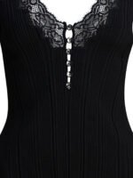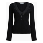 Ce top Self-Portrait allie féminité et sophistication grâce à une construction ajustée en maille côtelée extensible. Sa profonde encolure en V est sublimée par un délicat empiècement en dentelle qui apporte une touche raffinée et texturée. La fermeture frontale ornée de boutons façon diamant accentue l’élégance de la pièce, tandis que la matière stretch épouse la silhouette tout en conservant confort et maintien. Idéal pour un look chic et contemporain, ce top femme Self-Portrait s’impose comme une pièce élégante du vestiaire de saison.