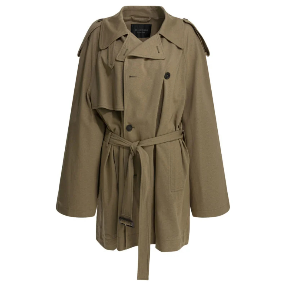 Ce trench court Explorer Balenciaga pour femme revisite l’iconique manteau trench dans une version contemporaine et structurée. Confectionné en jersey de coton léger au toucher sec, il offre une silhouette moderne et confortable. Le modèle présente des revers de trench classiques, une fermeture croisée à six boutons et des manches raglan qui renforcent son allure architecturale. Les épaulettes, les rabats coupe-vent à l’avant et au dos ainsi que les poches à rabat boutonnées soulignent son inspiration utilitaire. La ceinture ton sur ton avec boucle en cuir permet d’ajuster la silhouette, tandis que la coupe oversize apporte une touche résolument moderne.