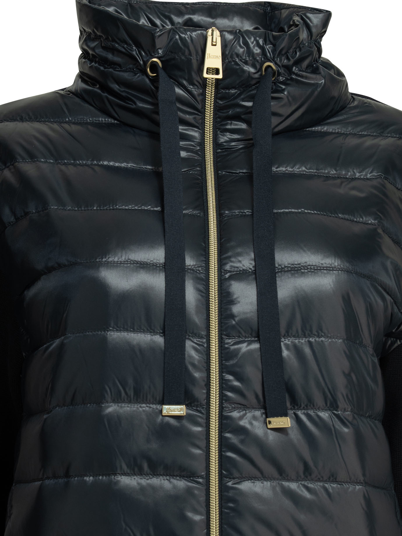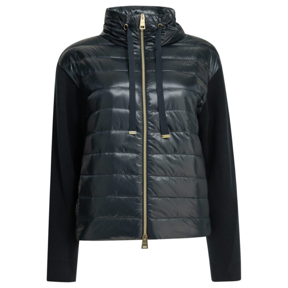 cette veste de la maison herno pour femme est une pièce de prêt-à-porter au design hybride et innovant conçue pour la saison printemps-été 2026. fabriquée en moldavie, elle est confectionnée dans une maille de pur coton (100 %) de finesse 14, associée à des empiècements frontaux et un col en nylon ultraléger 20 deniers (100 % polyamide), un tissu technique japonais reconnu pour sa légèreté extrême et sa résistance à l’eau. sa silhouette se distingue par une coupe courte (short silhouette) et des manches longues, offrant un équilibre parfait entre le confort d’un tricot et la technicité d’une doudoune. le design au coloris bleu marine (9200) présente une construction soignée avec un matelassage à rayures horizontales sur les parties techniques et un garnissage par injection de duvet de canard (90 % duvet, 10 % plumes) pour une isolation thermique optimale sans volume superflu. la structure inclut un col haut protecteur muni d’un cordon de serrage ajustable, une fermeture frontale par zip à double curseur, des poches passepoilées et un petit logo métallique discret appliqué au dos. ce modèle allie parfaitement le luxe des matières naturelles à la performance textile, constituant une pièce de mi-saison sophistiquée pour votre vestiaire de saison.