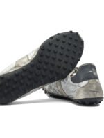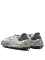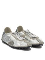 Les baskets Maison Margiela « Sprinters » s’inspirent des modèles de course rétro avec une esthétique audacieuse et contemporaine. Confectionnées en lamé métallique avec des empiècements en daim pailleté et des renforts en cuir de veau, elles présentent une construction technique mêlant différentes textures. Leur silhouette sportive est sublimée par un traitement vintage légèrement usé qui renforce leur caractère distinctif. La semelle à picots avec numérotation gravée et les surpiqûres emblématiques de Maison Margiela au talon signent ce modèle au style unique.