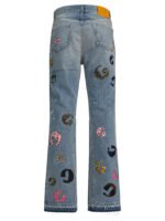 Le jean homme Gallery Dept. « G Time La Flare » en denim bleu clair adopte une silhouette ajustée à la jambe avec ouverture évasée, offrant une allure contemporaine et audacieuse. Confectionné en 100 % coton, il présente une structure cinq poches classique revisitée par un travail artisanal unique. Chaque pièce est vieillie, renforcée et retravaillée à la main, avec des détails peints et teints ainsi que des empiècements patchwork en denim et cuir. Le jacron en cuir gravé du logo Gallery Dept. au dos vient signer ce modèle au caractère distinctif.