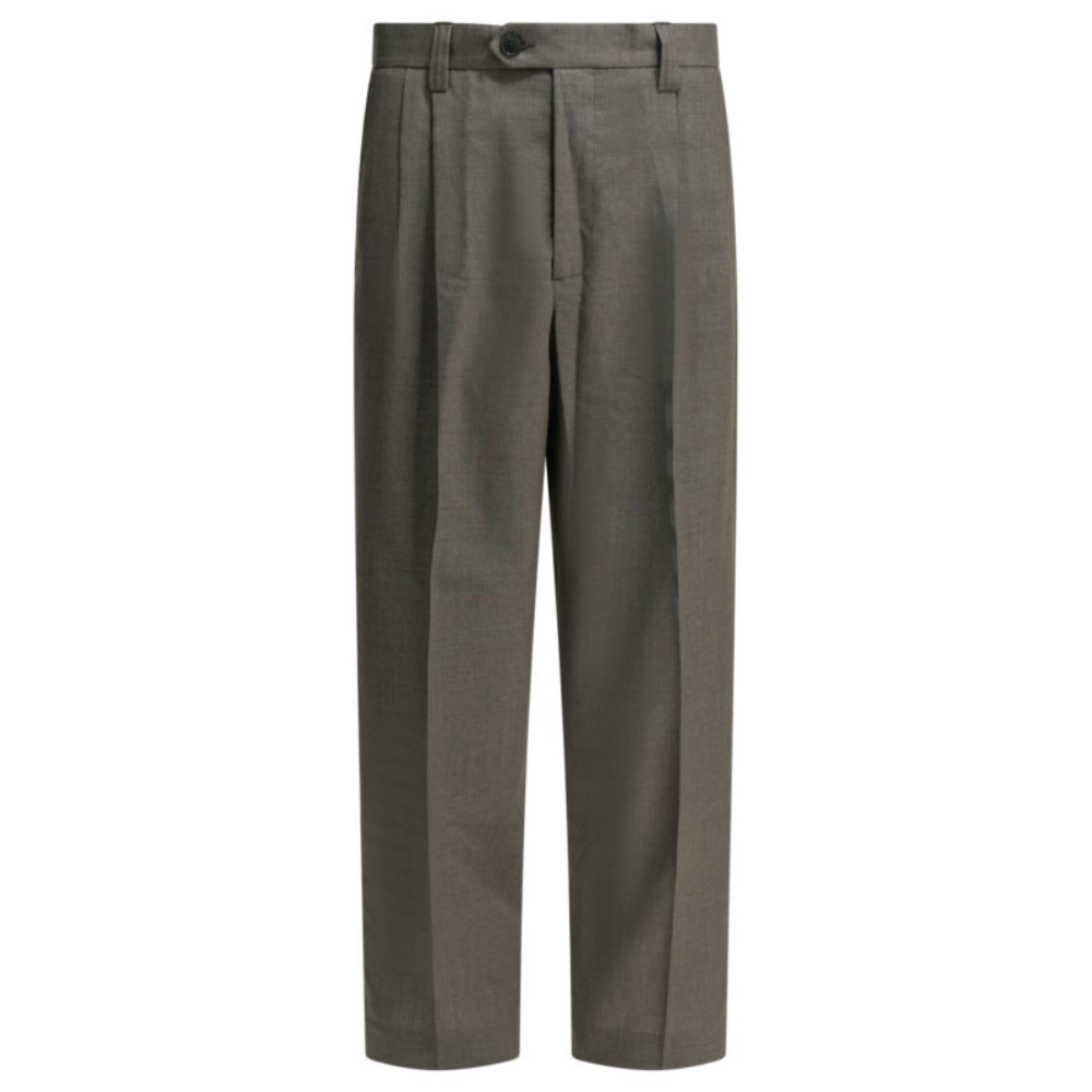 ce pantalon de la maison mfpen pour homme est une pièce de prêt-à-porter au design tailleur contemporain conçue pour la saison printemps-été 2026. fabriqué au portugal, il est intégralement confectionné dans un sergé de laine (100 %) au toucher sec (dry-hand), offrant une structure respirante, une excellente tenue et un tombé impeccable pour la mi-saison. sa silhouette se distingue par une coupe ample (wide fit) et une taille mi-haute (mid-rise), alliant l’esthétique minimaliste scandinave au confort d’un volume moderne et généreux. le design au coloris marron clair (light taupe) présente une construction soignée avec des doubles pinces frontales (double front pleats) qui accentuent l’amplitude et le caractère structuré du modèle. la structure inclut une fermeture sophistiquée par bouton en résine noire, crochet et zip ykk, ainsi que des poches latérales et des poches arrière passepoilées. doté d’une doublure intérieure en polyester recyclé, ce modèle allie parfaitement le tailoring traditionnel à une vision urbaine décontractée, constituant une pièce maîtresse de caractère pour votre vestiaire de saison.