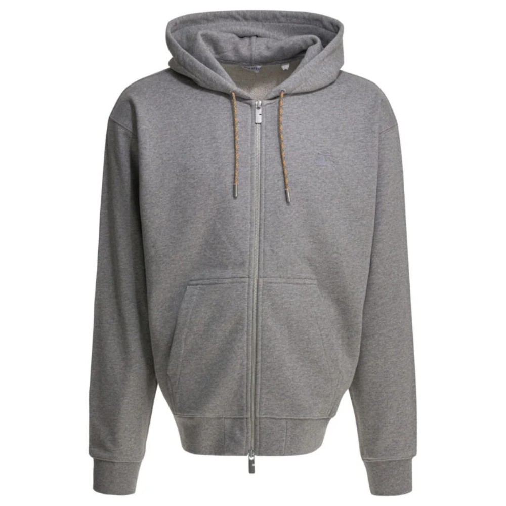 Ce sweatshirt zippé Burberry pour homme associe confort contemporain et héritage iconique de la maison britannique. Confectionné en coton, il présente une silhouette décontractée aux lignes épurées, soulignée par des épaules légèrement tombantes et des finitions côtelées aux poignets et à l’ourlet. La capuche intégrée ajustable par cordon et la fermeture zippée double curseur renforcent la fonctionnalité du modèle, tandis que les poches kangourou à l’avant apportent un aspect pratique. Les empiècements à motif Check sur les coudes signent discrètement la pièce, idéale pour la saison printemps-été.