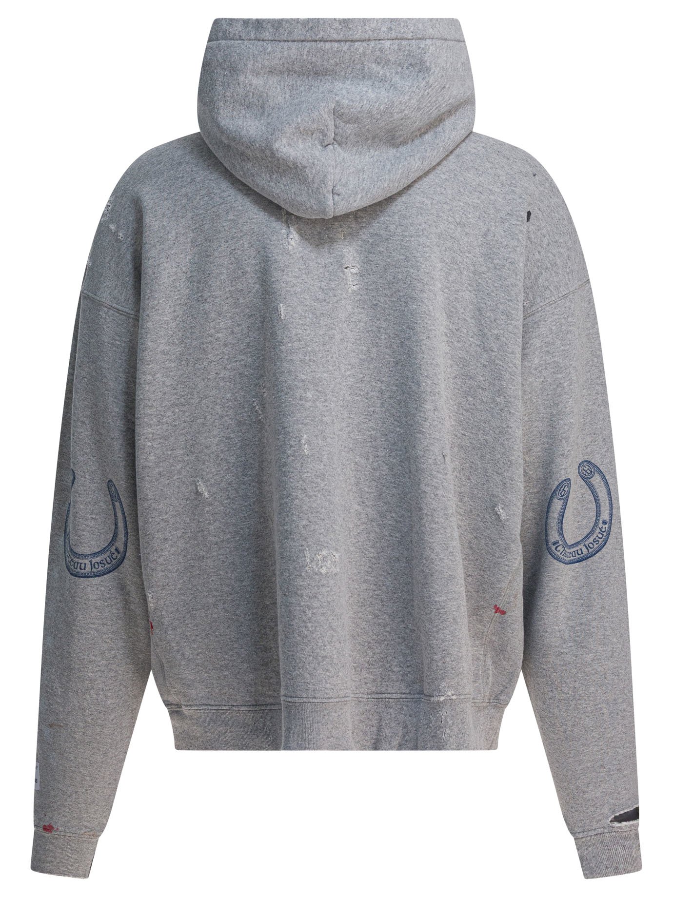 Ce sweat à capuche Gallery Dept. pour homme s’inspire de l’esthétique des années 90 avec une silhouette ample et décontractée. Confectionné en coton, il présente une construction confortable avec capuche intégrée, poignets et ourlet côtelés. Sur le devant, l’inscription « Chateau Ranch » apporte une signature graphique distinctive, tandis que les motifs fer à cheval « Chateau Josué » imprimés sur les coudes renforcent l’identité visuelle du modèle. Chaque pièce est décorée à la main, avec l’appliqué « Art on Display » sur le poignet qui souligne l’approche artistique de la marque.