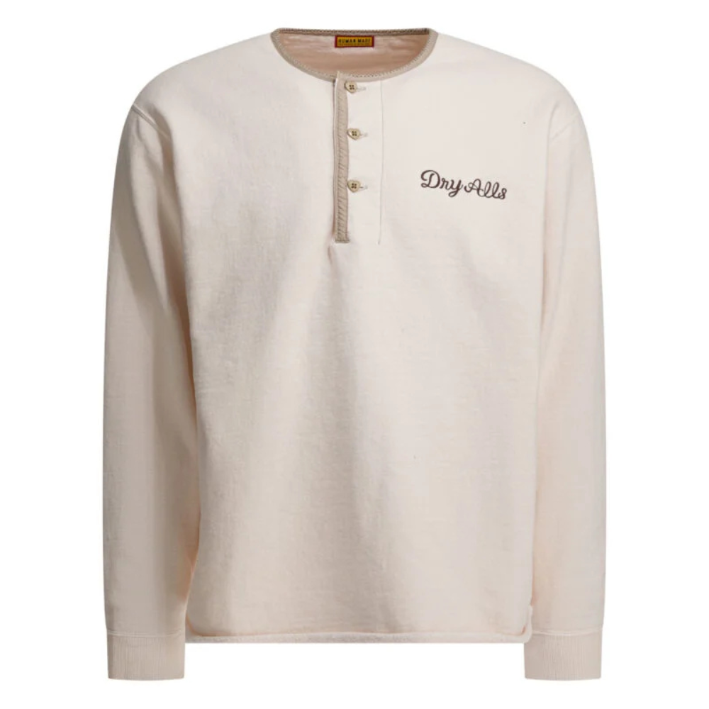 Ce sweatshirt Human Made pour homme revisite le style classique du henley avec l’esthétique distinctive de la marque japonaise. Confectionné en coton brossé, il offre une texture douce et chaleureuse idéale pour la saison automne-hiver. Sa coupe regular assure un confort naturel et une silhouette équilibrée au quotidien. Le col henley se distingue par une fermeture à trois boutons en forme de cœur, signature originale du modèle. Le logo Human Made imprimé dans le dos et la broderie « Dry Alls » sur la poitrine gauche viennent compléter ce design à la fois minimaliste et emblématique.