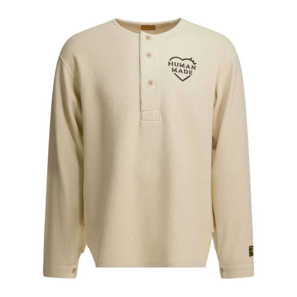 Le t-shirt « Henley » Human Made pour homme est confectionné en coton épais à surface tridimensionnelle, offrant texture et tenue pour la saison automne/hiver 2025. Sa silhouette droite avec épaules régulières et manches longues assure une coupe confortable et structurée. Des graphismes appliqués ornent la poitrine et l’arrière gauche, tandis qu’une étiquette d’identification style militaire est cousue sur la manche gauche. Les fentes latérales en bas et la fermeture boutonnée aux poignets complètent ce modèle au caractère utilitaire affirmé.