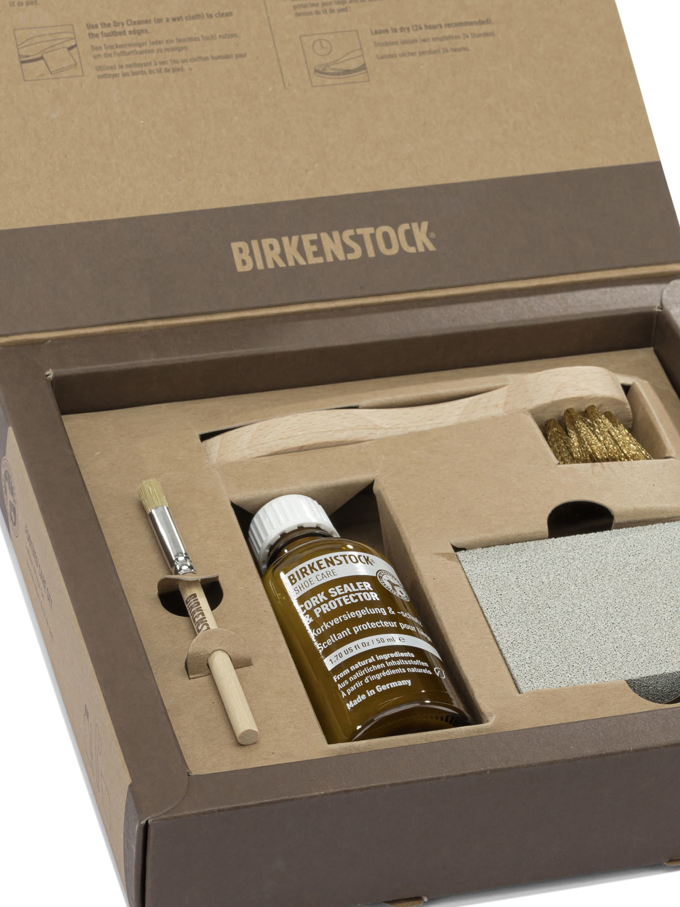 le kit d’entretien footbed care set de la maison birkenstock est un ensemble complet conçu pour la saison printemps-été 2026 afin de préserver et prolonger la durée de vie de vos sandales. fabriqué en allemagne, ce nécessaire de soin spécifique se compose de trois éléments essentiels. le scellant protecteur pour liège, formulé à base de résine, nourrit et scelle les bords du lit de pied ainsi que les micro-fissures, empêchant l’assèchement et la fragilité du matériau ; il s’applique précisément grâce à son pinceau intégré. le kit inclut également une brosse à daim spécialisée, idéale pour éliminer la poussière et les taches légères sur les cuirs velours et les semelles intérieures. enfin, un nettoyant à sec double face complète l’ensemble : sa face crêpée drue élimine la saleté incrustée, tandis que sa face douce permet de rebrousser délicatement les poils du daim ou du nubuck. ce coffret est l’accessoire indispensable pour maintenir l’aspect neuf et le confort anatomique de vos chaussures birkenstock.