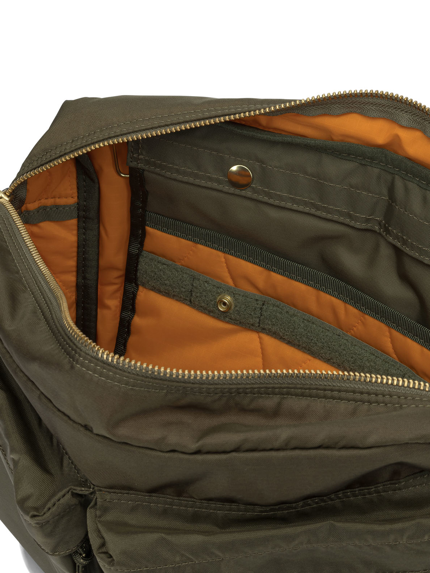ce sac bandoulière (crossbody) de la maison porter-yoshida & co pour homme est une pièce de bagagerie au design technique et utilitaire conçue pour la saison printemps-été 2026. fabriqué au japon, il est intégralement confectionné dans un nylon 6 de 210 deniers (100 %) de qualité industrielle, offrant une structure d’une robustesse exceptionnelle, une légèreté optimale et une résistance aux déchirures propre aux standards de la manufacture artisanale japonaise. sa silhouette se distingue par une ligne épurée et une construction inspirée des vêtements militaires, alliant l’esthétique « surplus » de la griffe à une fonctionnalité urbaine idéale pour vos déplacements de prestige. le design au coloris vert olive présente une construction soignée avec une légère variation de teinte entre le corps principal et la poche frontale — obtenue par l’usage de bains de teinture différents — signature du prestige et de l’authenticité de la ligne « force ». la structure inclut une doublure matelassée en nylon ripstop orange vif, jusqu’à quatre types de sangles en nylon stratégiquement appliquées et une poche intérieure amovible utilisable séparément, garantissant une modularité exemplaire et une protection accrue de vos effets personnels. ce modèle allie parfaitement la noblesse d’une fibre synthétique haute performance à une ingénierie de conception militaire, constituant un accessoire de luxe pour votre vestiaire technique.