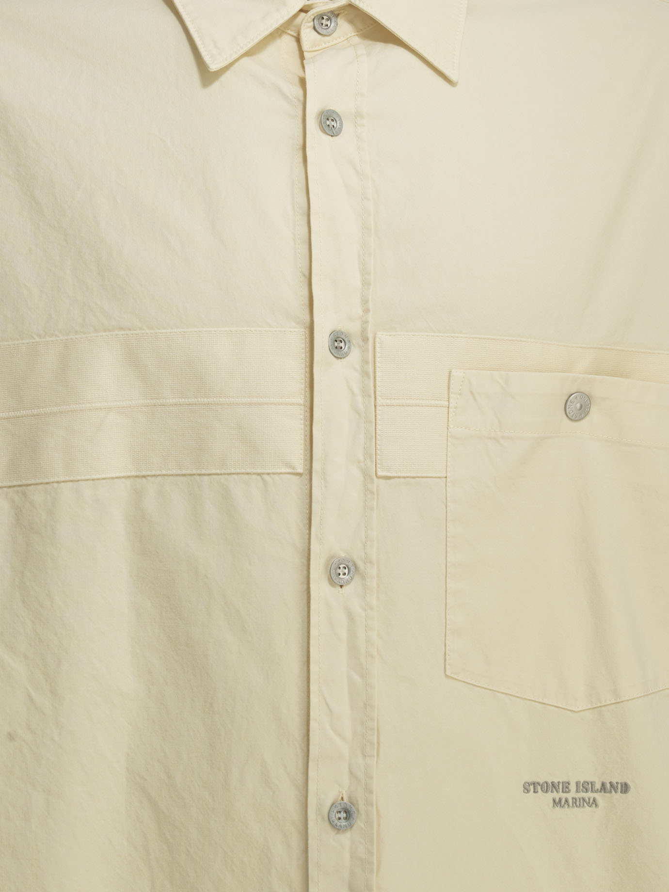 cette chemise de la maison stone island pour homme est une pièce de prêt-à-porter au design nautique et fonctionnel conçue pour la saison printemps-été 2026. fabriquée en italie, elle est confectionnée dans un tissu panama de première qualité mêlant nylon et coton organique, offrant une structure robuste, une main technique et une excellente respirabilité propre aux standards de la ligne stone island marina. sa silhouette se distingue par sa construction boutonnée et son traitement de teinture en pièce (garment dyed), alliant l’esthétique archive de la griffe à une sophistication urbaine idéale pour vos tenues de prestige décontractées. le design au coloris blanc présente une construction soignée avec une bande de coton appliquée sur la poitrine et la broderie « stone island marina », signature du prestige et de l’identité visuelle de la collection. la structure inclut un ourlet arrondi plus long à l’arrière et une poche plaquée technique, garantissant une silhouette équilibrée, une grande liberté de mouvement et un confort de porter exemplaire. ce modèle allie parfaitement la noblesse de fibres organiques sélectionnées à une ingénierie de tissage moderne, constituant une pièce de collection indispensable pour votre vestiaire.