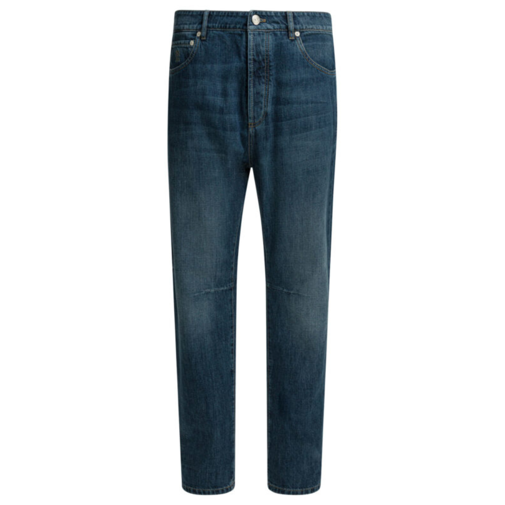 ce jean de la maison brunello cucinelli pour homme est une pièce de prêt-à-porter au design intemporel et rigoureux conçue pour la saison printemps-été 2026. fabriqué en italie, il est intégralement confectionné dans un denim japonais de première qualité pesant 9,5 oz (100 % coton), offrant une structure au poids équilibré, une grande résistance et une authenticité propre aux standards de la haute manufacture de solomeo. sa silhouette se distingue par une coupe « leisure » à jambe droite qui assure un confort optimal au niveau des hanches tout en s’ajustant progressivement le long de la jambe, alliant l’esthétique décontractée de la griffe à une ligne élégante idéale pour vos tenues de saison. le design au coloris bleu indigo présente une construction soignée selon la tradition des cinq poches avec une fermeture frontale par boutons métalliques, signature du prestige et de l’attention portée aux détails par brunello cucinelli. la structure inclut une poche ticket à l’avant, des poches plaquées à l’arrière et un bas de jambe épuré, garantissant une tenue de forme stable et une silhouette masculine impeccable. ce modèle allie parfaitement la noblesse d’une toile japonaise de renommée mondiale à une ingénierie de coupe artisanale, constituant un essentiel de prestige pour votre vestiaire.