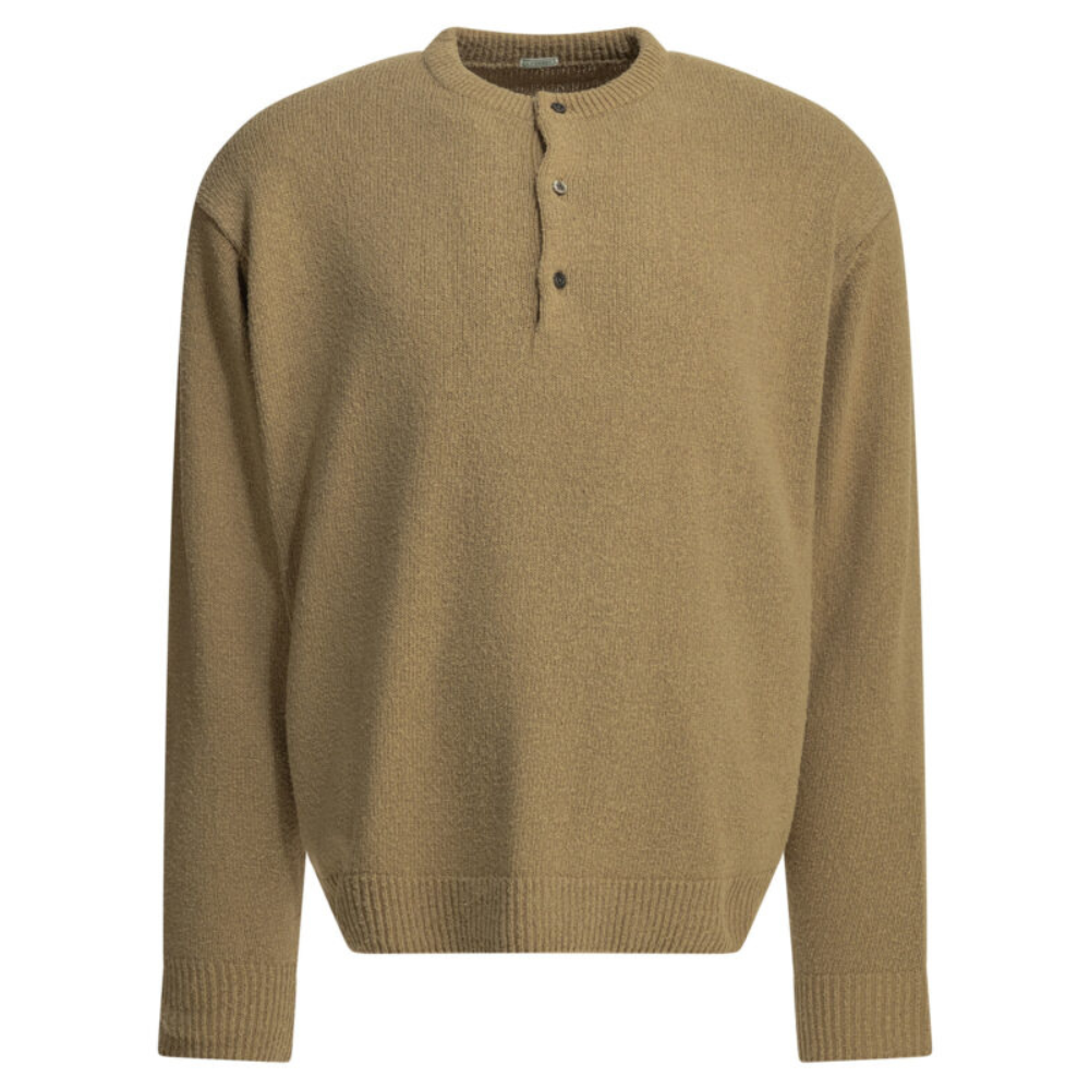 ce pull à col henley de la maison a.presse pour homme est une pièce de prêt-à-porter au design artisanal et luxueux conçue pour la saison printemps-été 2026. fabriqué au japon, il est intégralement confectionné dans un fil de soie ponge de première qualité (100 %), offrant une structure épaisse, une main texturée et une excellente régulation thermique propre aux standards de la haute manufacture nippone. sa silhouette se distingue par l’utilisation d’un fil présentant des irrégularités et des nœuds (slub structure), alliant l’esthétique brute de la griffe à une sophistication discrète idéale pour vos tenues de prestige. le design au coloris beige présente une construction soignée avec une encolure boutonnée profonde et des boutons en nacre noire, signature du prestige et de l’ingénierie textile d’a.presse. la structure inclut des manches montées et une longueur légèrement écourtée, garantissant une silhouette équilibrée, une grande liberté de mouvement et un confort de porter exemplaire. ce modèle allie parfaitement la noblesse d’une fibre naturelle sélectionnée à une ingénierie de tricotage à l’aspect fait main, constituant une pièce de collection indispensable pour votre vestiaire.