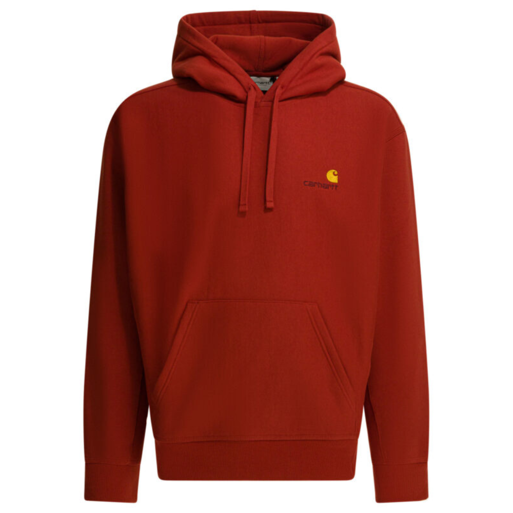 ce sweat-shirt à capuche de la maison carhartt wip pour homme est une pièce de prêt-à-porter au design robuste et urbain conçue pour la saison printemps-été 2026. fabriqué au cambodge, il est confectionné dans un mélange de coton et de polyester de première qualité (80 % coton / 20 % polyester), offrant une structure dense, un intérieur brossé pour plus de douceur et une excellente résistance à l’usure propre aux standards de la ligne work-in-progress. sa silhouette se distingue par une coupe confortable et une ligne décontractée, alliant l’esthétique utilitaire de la griffe à une modernité quotidienne idéale pour vos tenues de prestige. le design au coloris rouge vif présente une construction soignée avec des finitions de couture renforcées, signature du prestige et de la durabilité textile de carhartt wip. la structure inclut une capuche ajustable par cordon de serrage, une poche kangourou frontale et des finitions en bord-côte aux poignets et à la base, garantissant une isolation thermique optimale et une tenue de forme exemplaire. ce modèle allie parfaitement la noblesse d’une fibre naturelle à une ingénierie de textile technique, constituant un essentiel de luxe pour votre vestiaire.