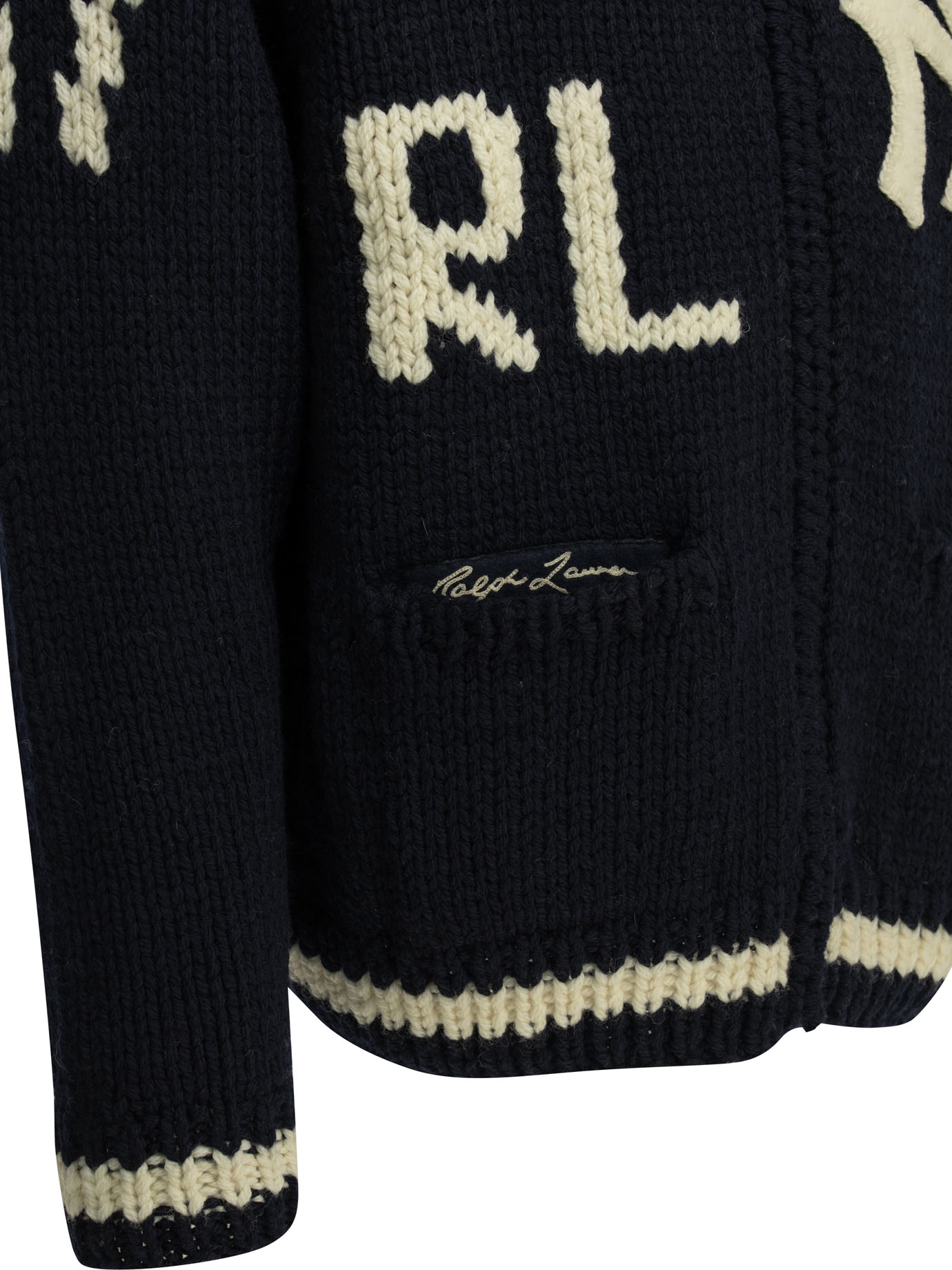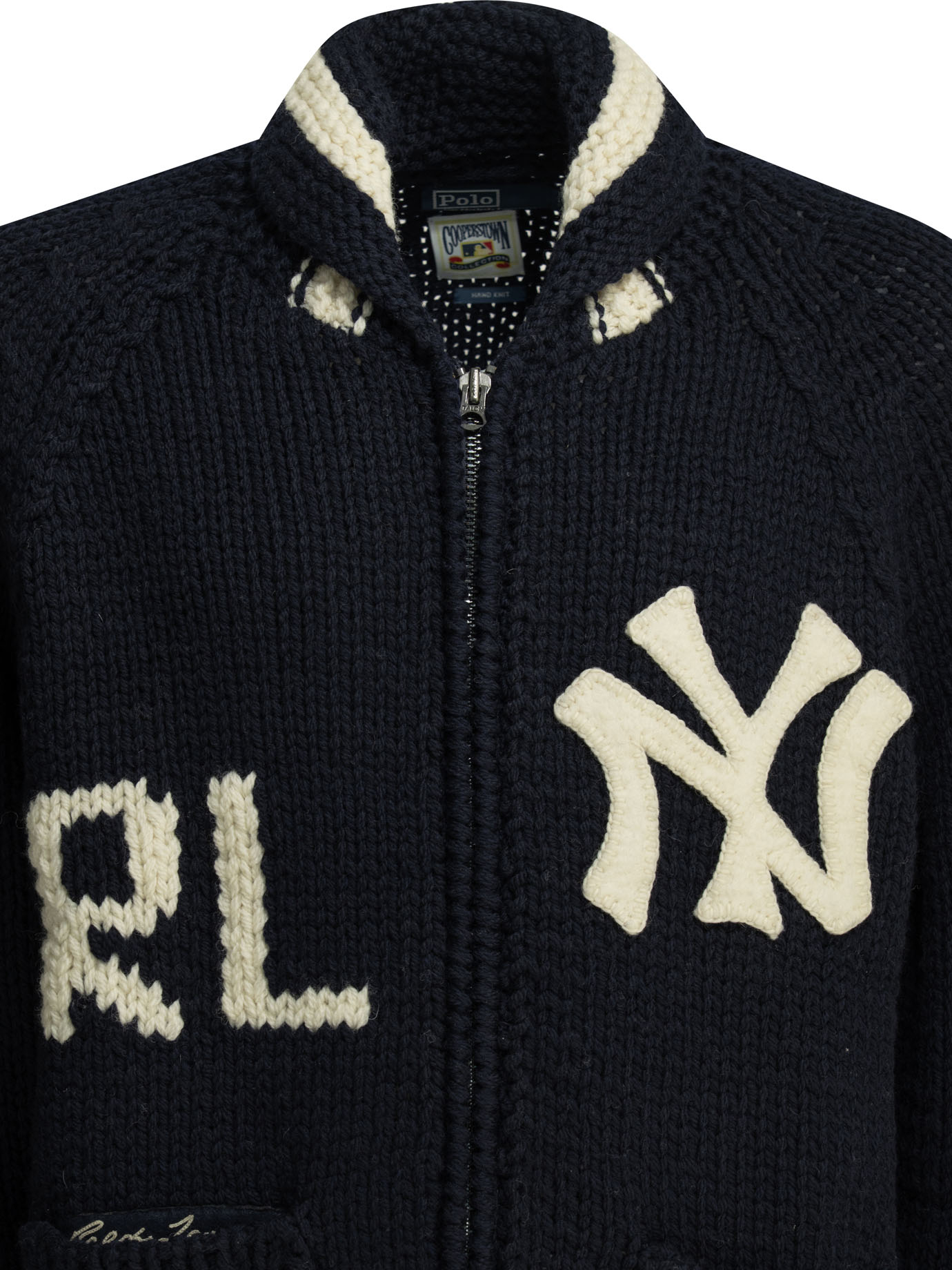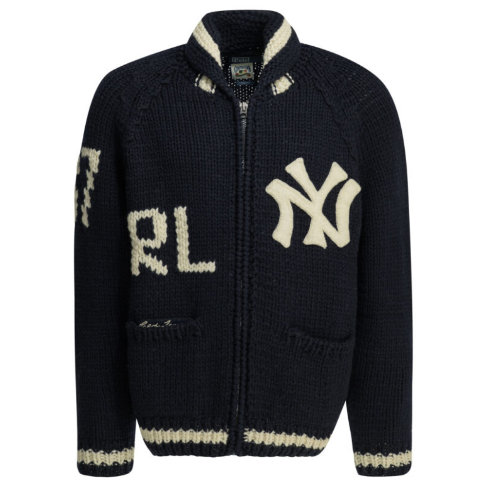 ce cardigan de la maison polo ralph lauren pour homme est une pièce d’exception issue d’une collaboration exclusive, conçue pour la saison printemps-été 2026. fabriqué en uruguay, il est intégralement confectionné dans une laine de première qualité (100 %) selon une technique de tricotage intarsia de haute précision, offrant une structure thermique équilibrée, une main douce et une excellente tenue propre aux standards de la haute manufacture de luxe américaine. sa silhouette se distingue par son col châle rayé et sa construction riche en détails iconographiques, alliant l’esthétique du baseball classique à une sophistication urbaine idéale pour vos tenues de prestige. le design au coloris bleu marine « navy combo » présente une construction soignée avec de multiples motifs incrustés, signature du prestige et de l’identité visuelle de cette collection capsule dédiée aux yankees. la structure inclut une fermeture zippée intégrale et des manches raglan, garantissant une silhouette équilibrée, une grande liberté de mouvement et un confort de porter exemplaire. ce modèle allie parfaitement la noblesse d’une fibre naturelle sélectionnée à une ingénierie de tricotage complexe, constituant une pièce de collection indispensable pour votre vestiaire.